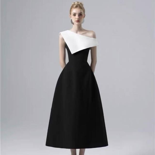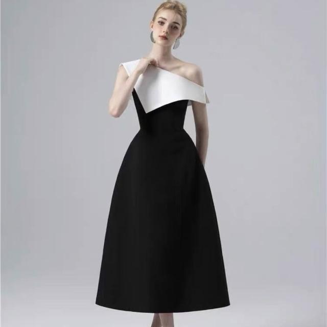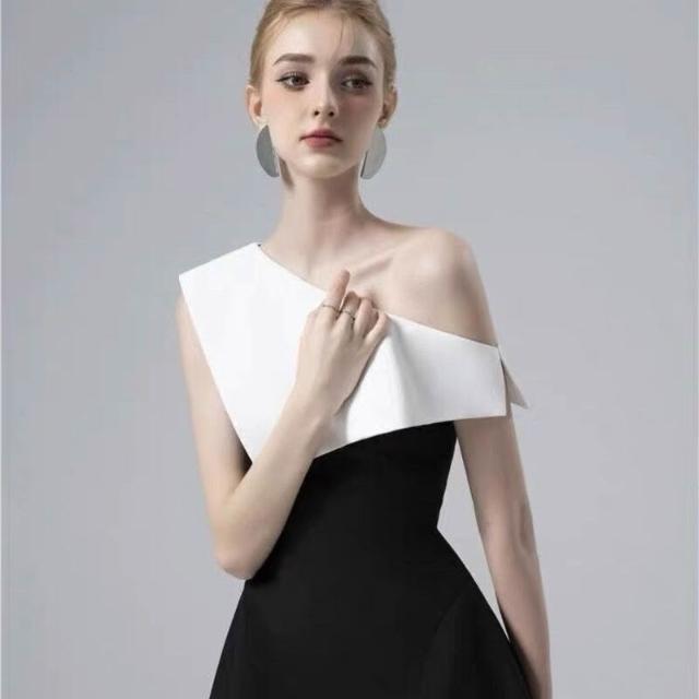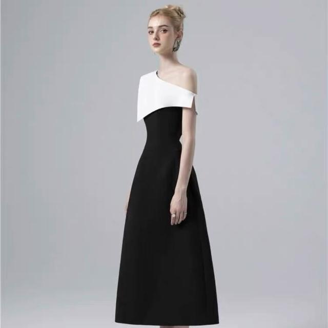 歐萊 春夏越南小眾設計經典黑白拼色斜肩露肩禮服長裙簡約連衣裙子