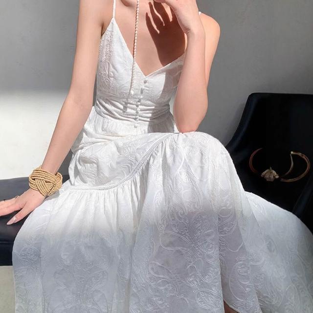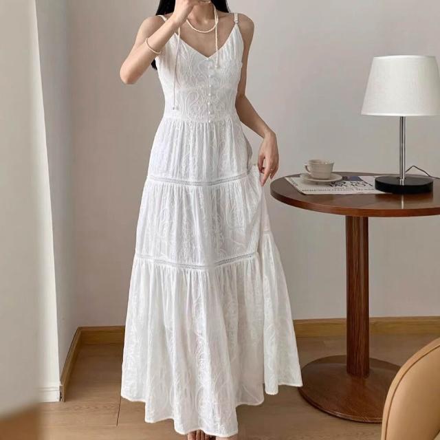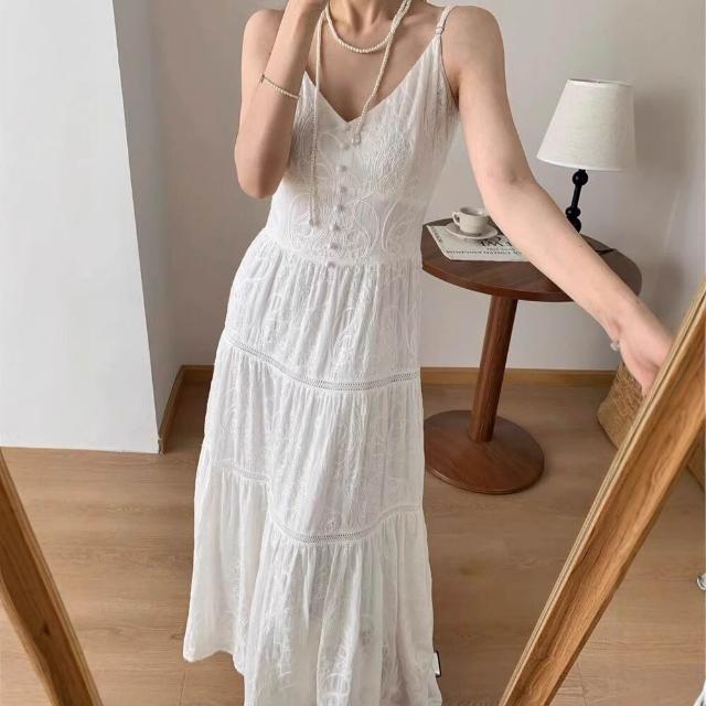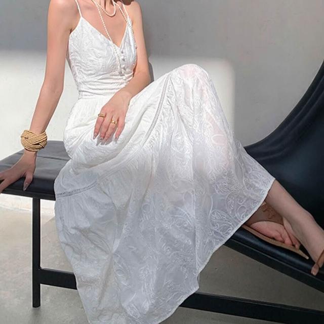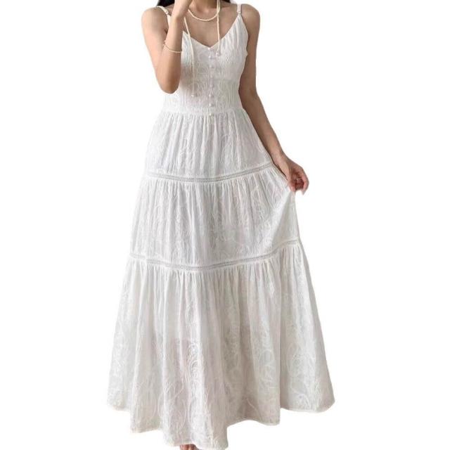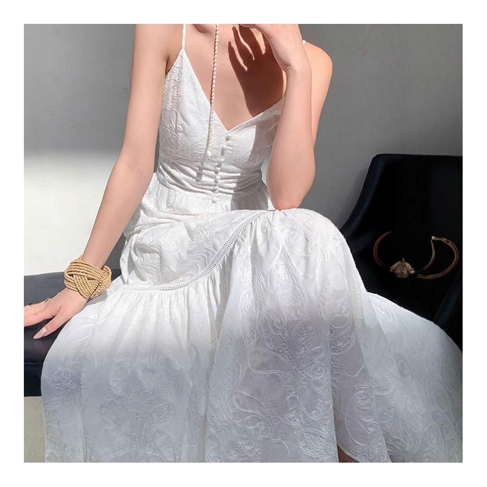 歐萊 白色度假風無袖吊帶海邊連衣裙女夏季收腰顯瘦氣質重工高級感長裙