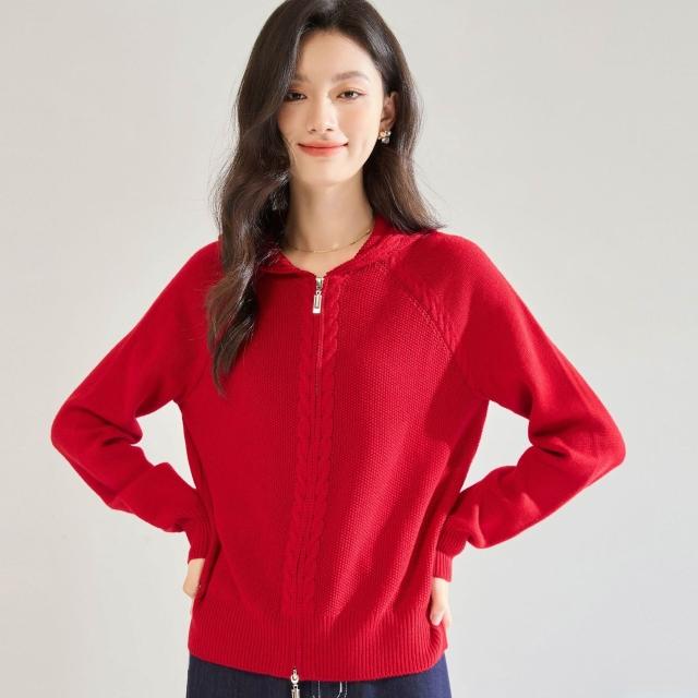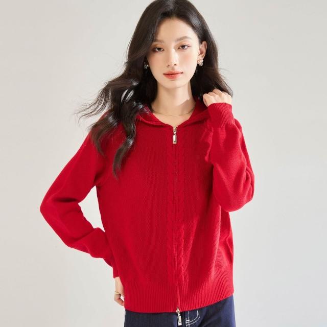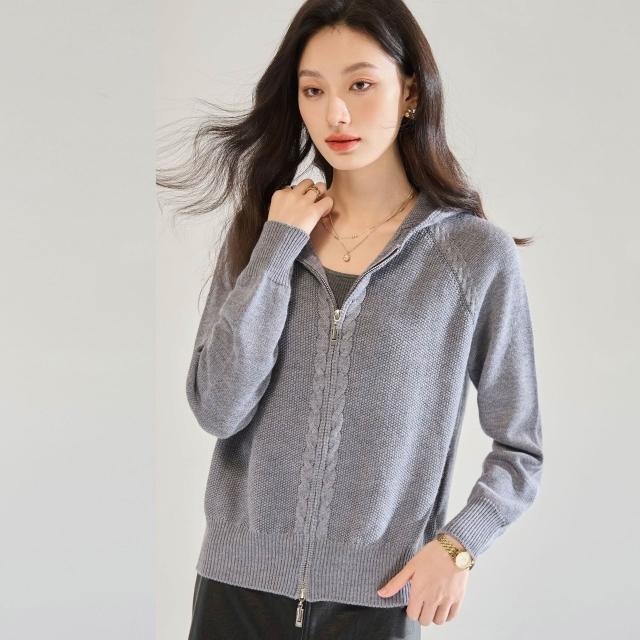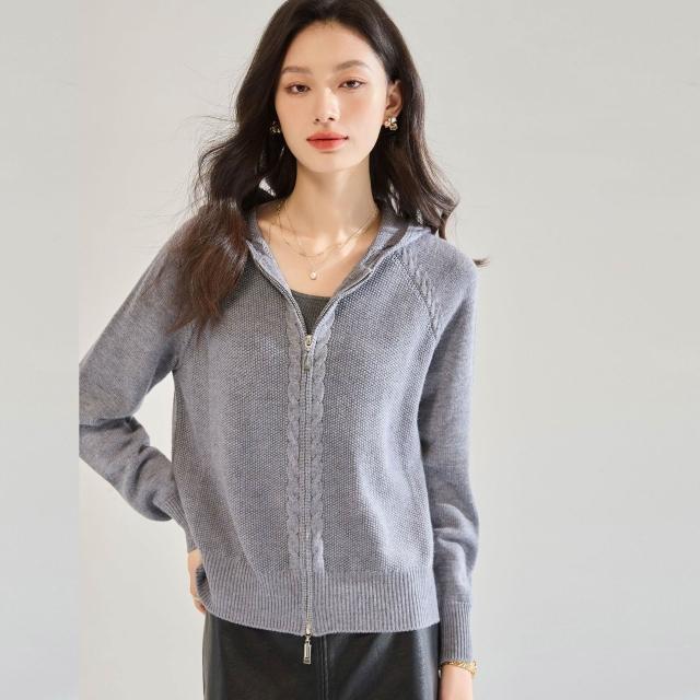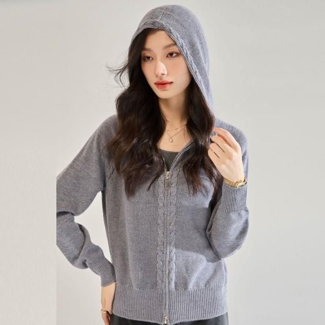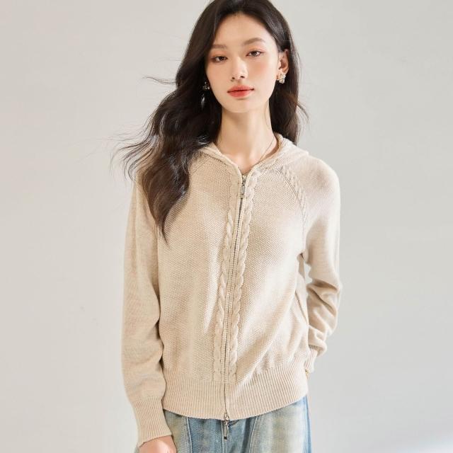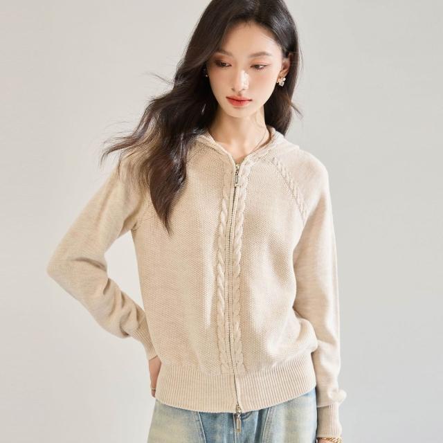 歐萊 25秋冬新絞花雙拉鏈羊毛針織衫連帽寬松開衫毛衣外套上衣女22659