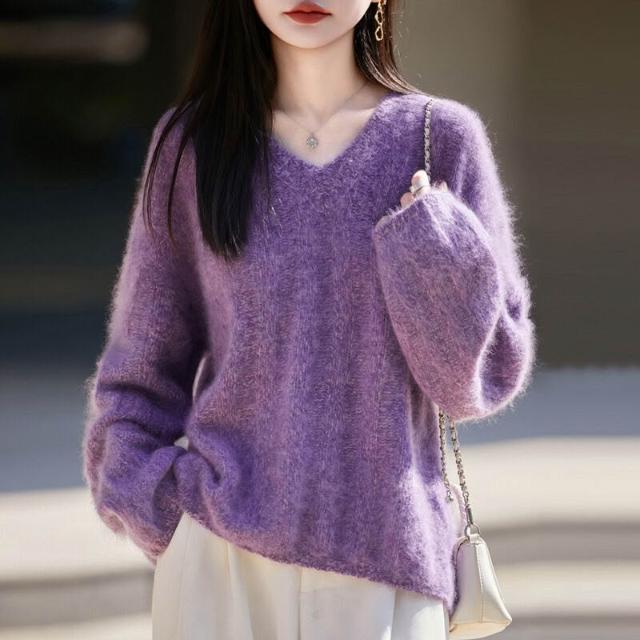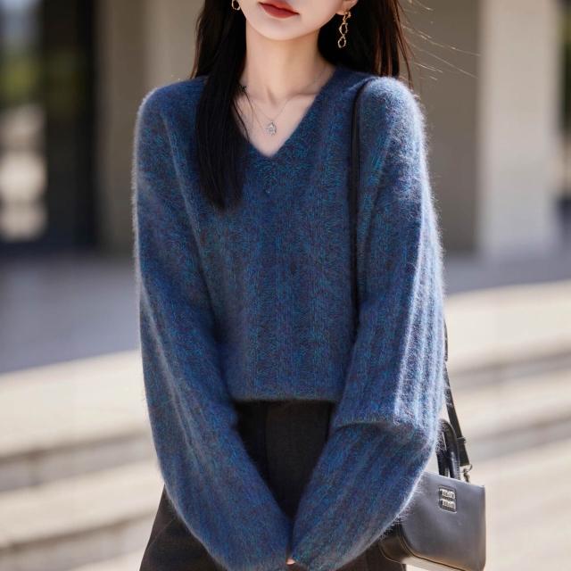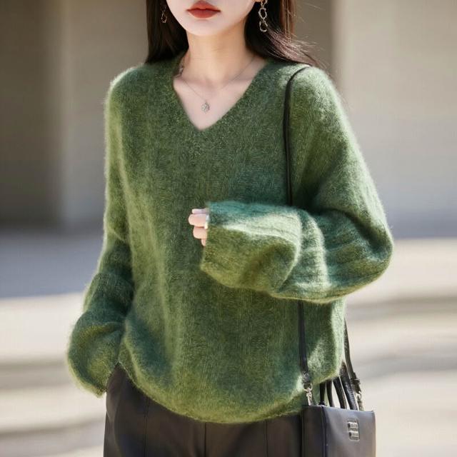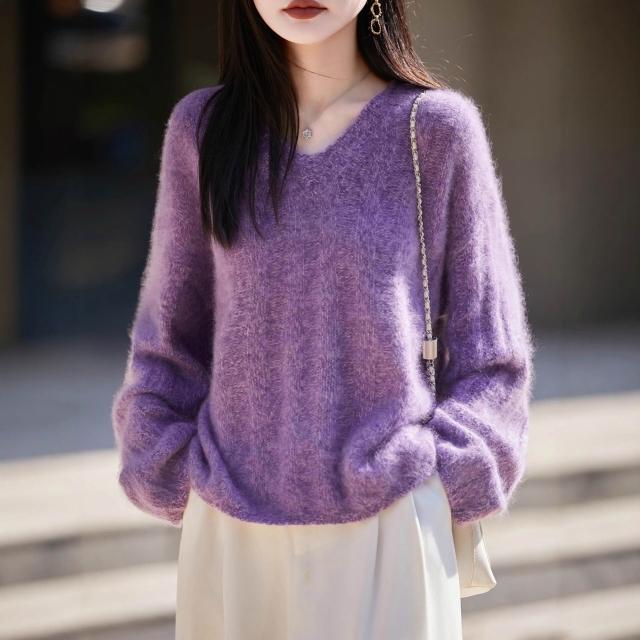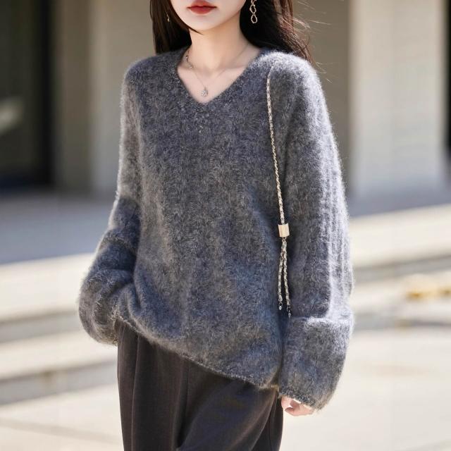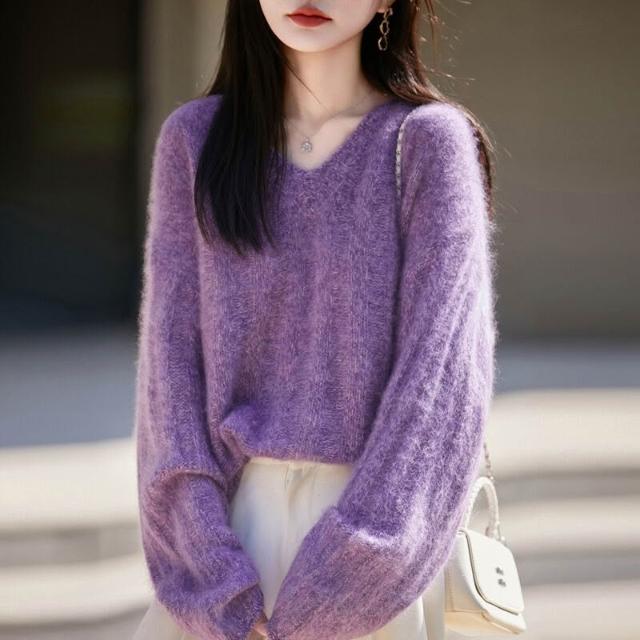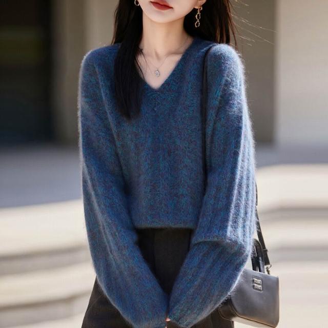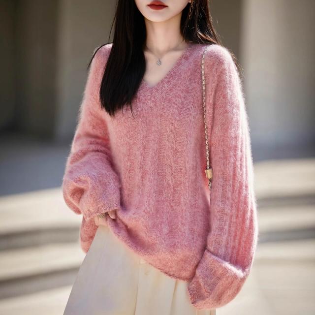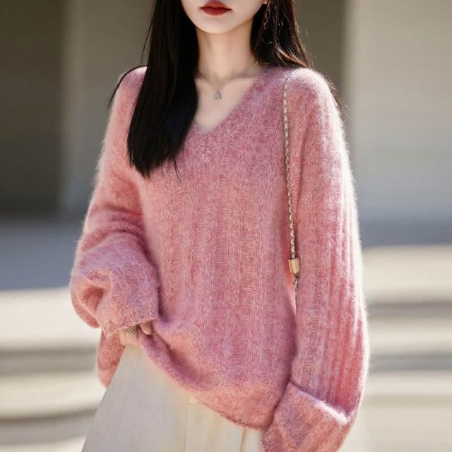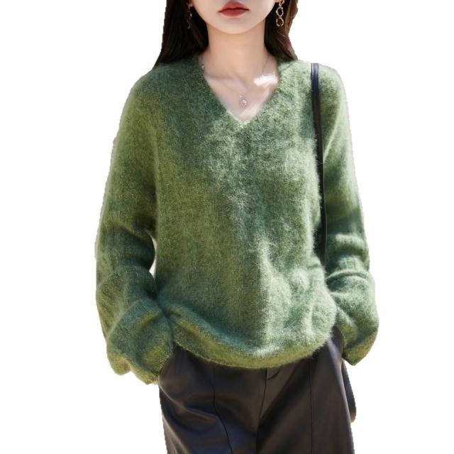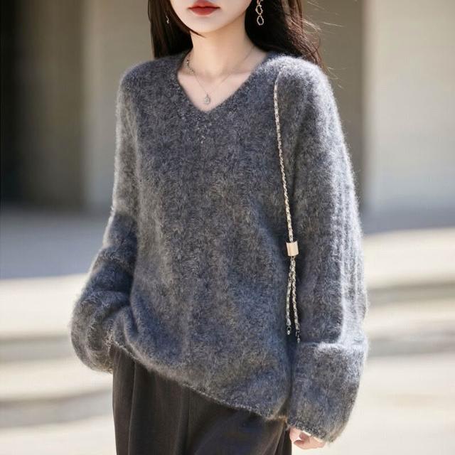 歐萊 2025秋冬羊毛衫女花紗V領無縫拉絨慵懶風套頭毛衣寬松內搭針織衫