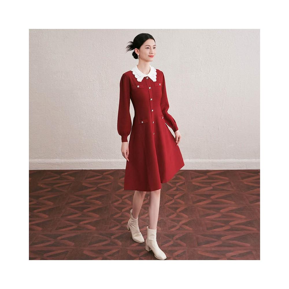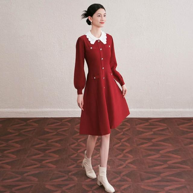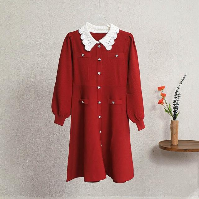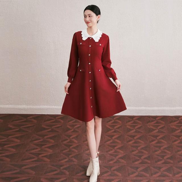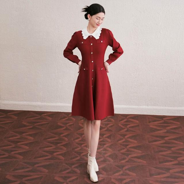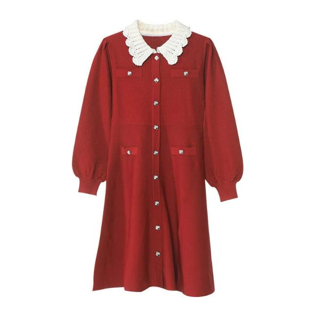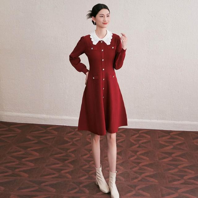 欧莱 秋冬新款法式撞色手工勾花镂空翻領修身顯瘦中長款針織連衣裙女