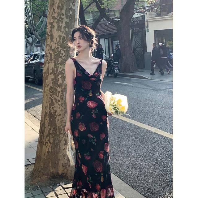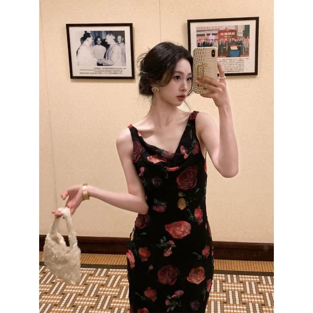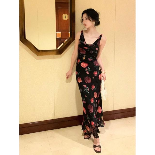 欧莱 提花蕩領年代感連衣裙女2025夏季新款收腰修身顯瘦長裙子
