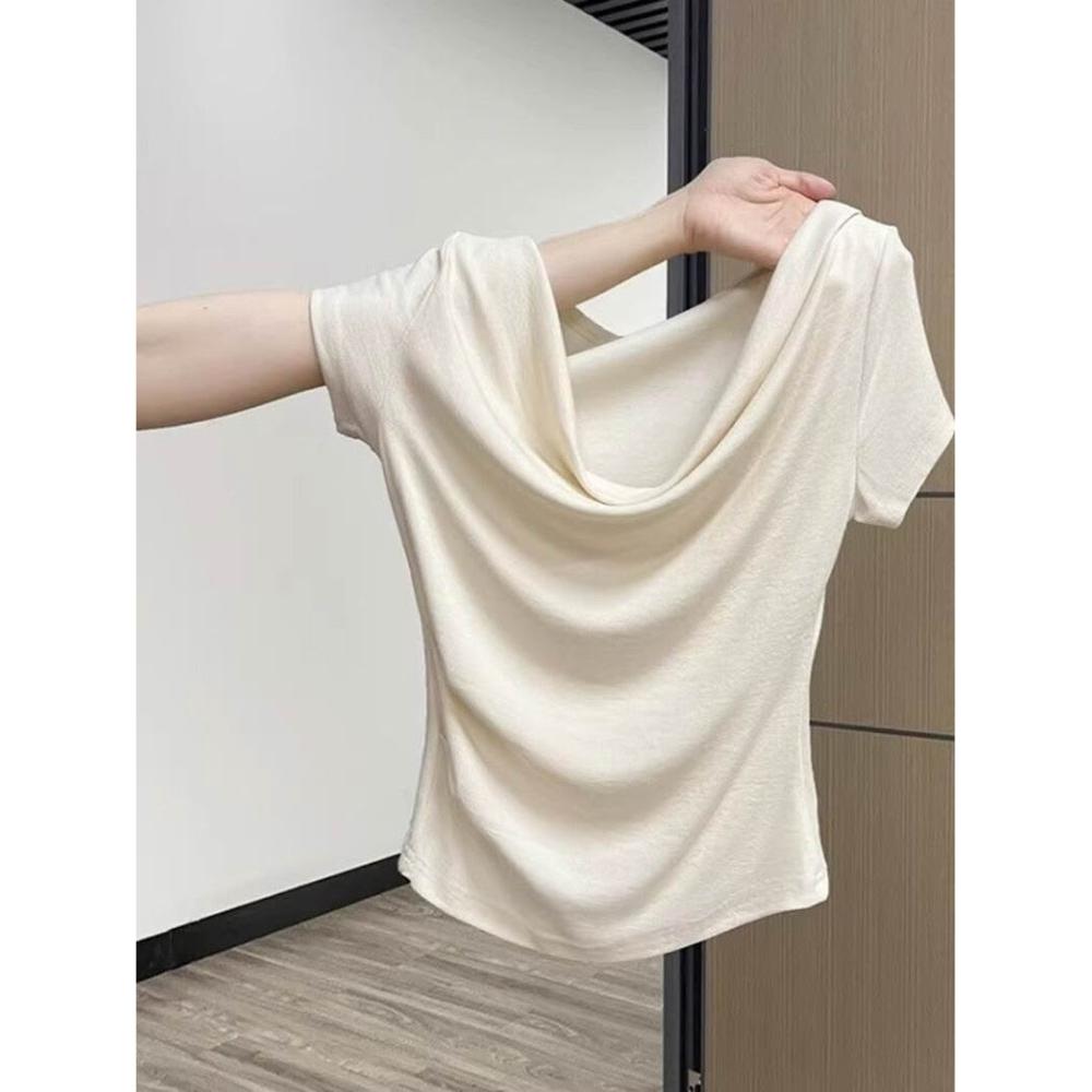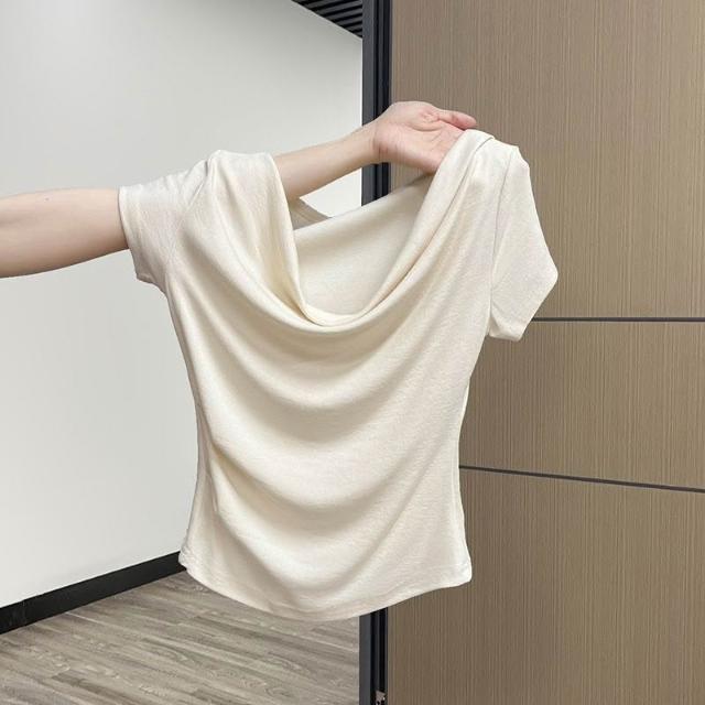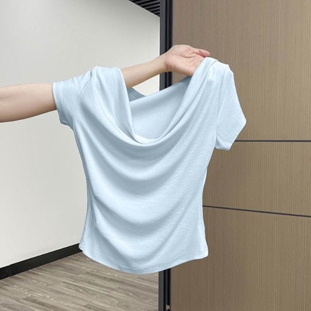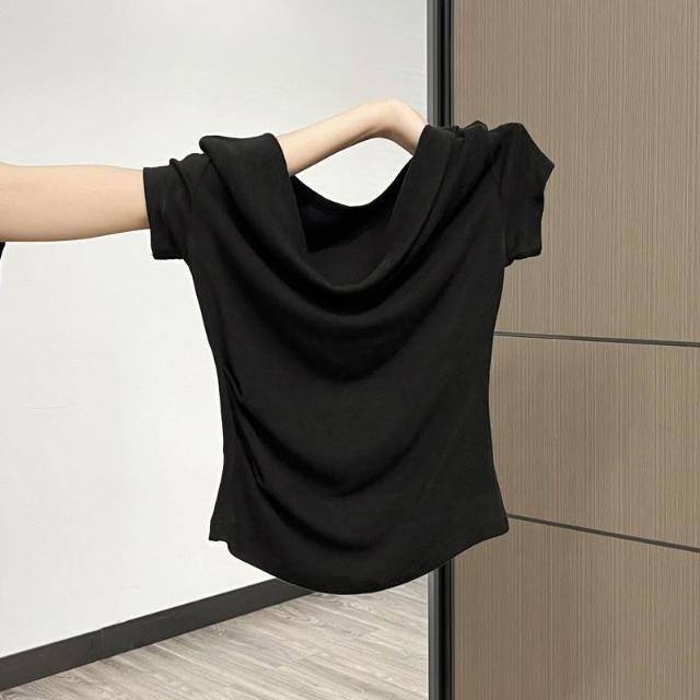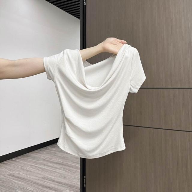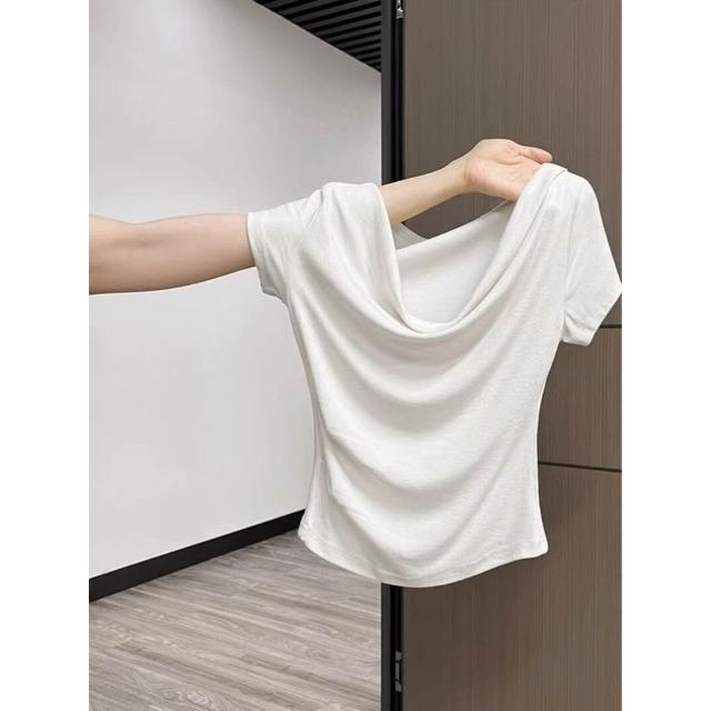 歐萊 法式一字肩短袖T恤女夏季甜辣小眾褶皺修身收腰設計感絕美小上衣