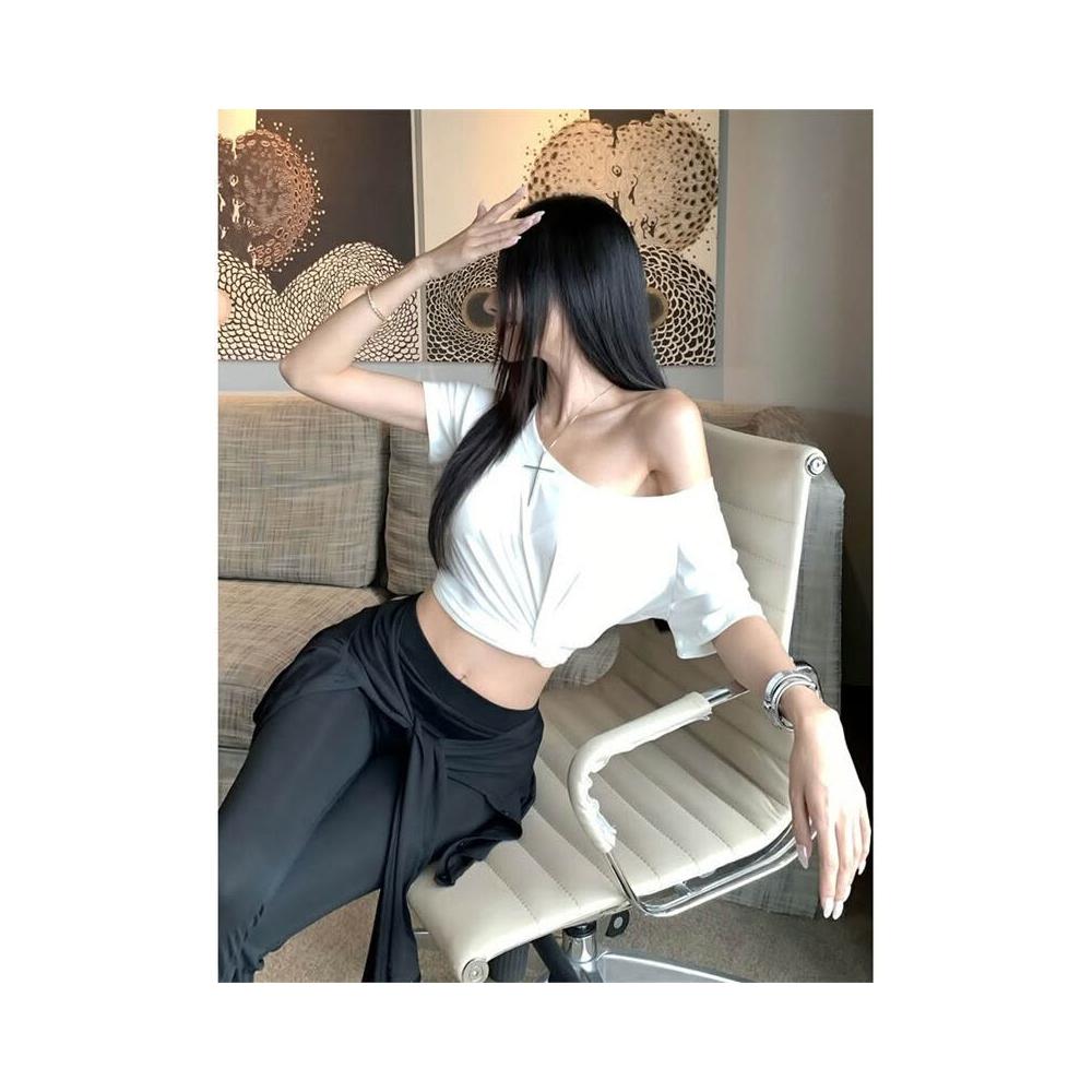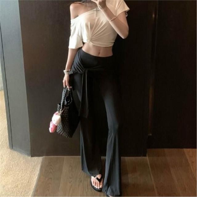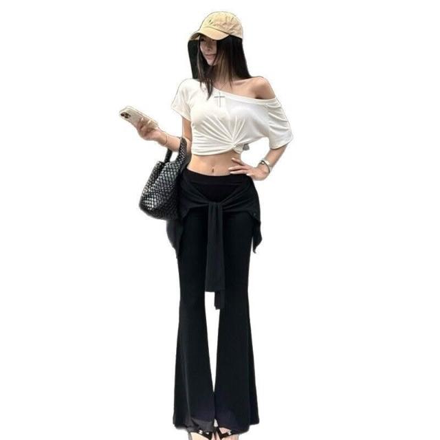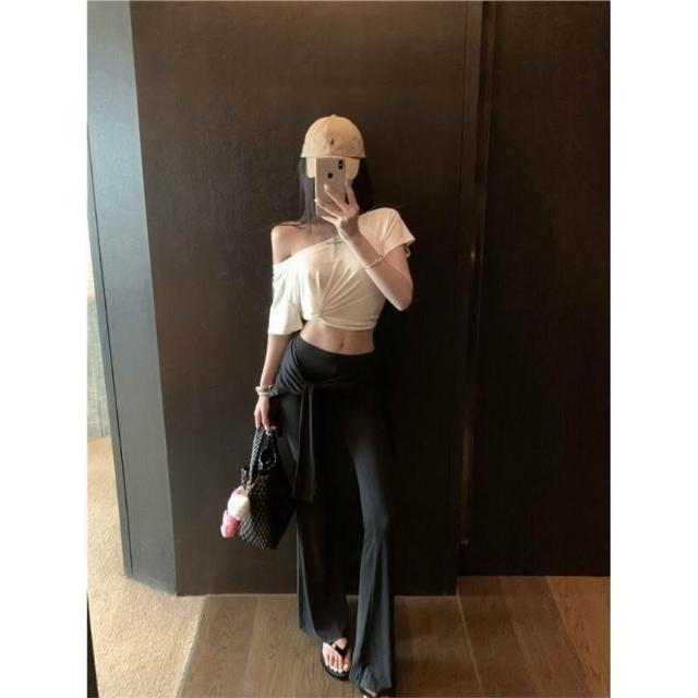 歐萊 設計感扭結斜肩修身短袖上衣假兩件綁帶疊穿喇叭褲休閑氣質套裝女