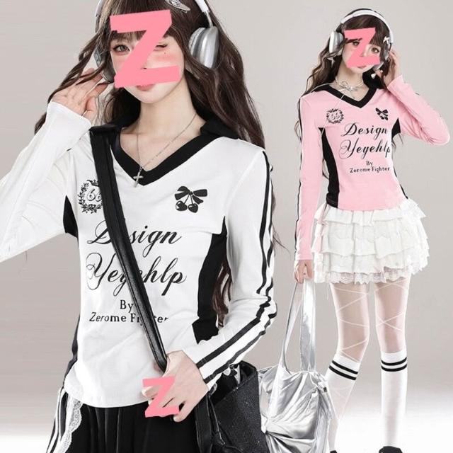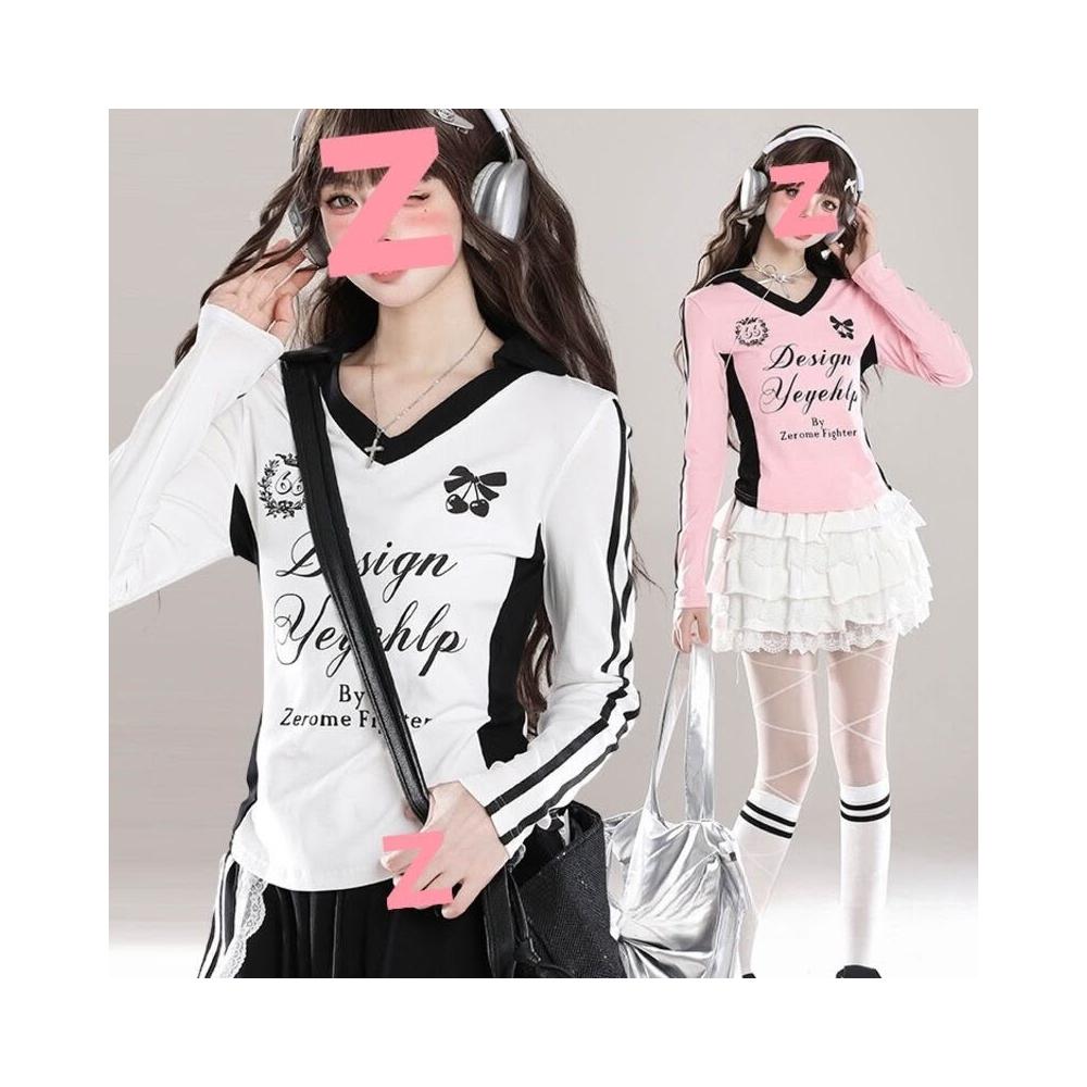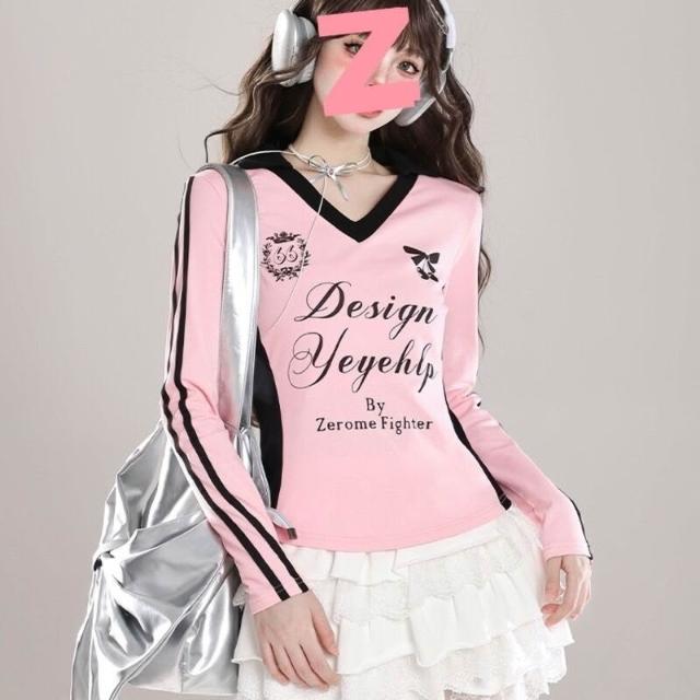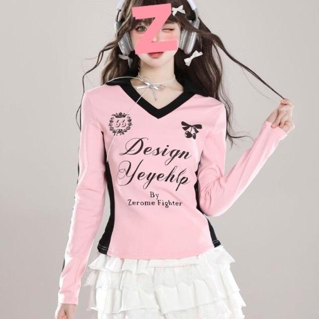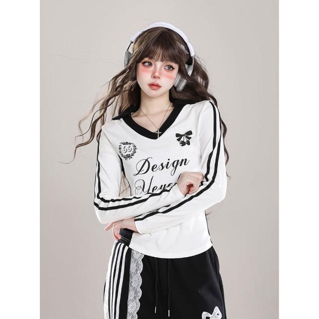 歐萊 美式辣妹V領長袖T恤女秋季澤西風打底內搭設計感修身收腰顯瘦上衣