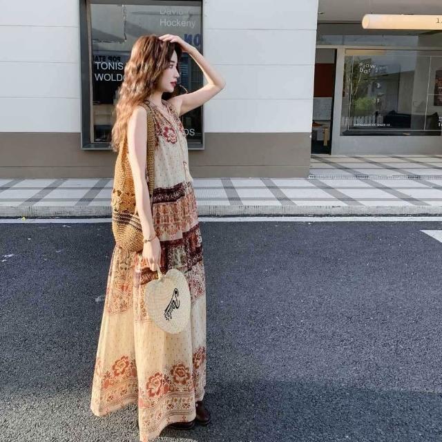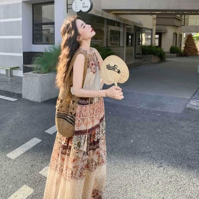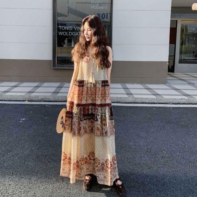 波西米亞印花吊帶連衣裙女2025夏季新款民族度假風顯瘦長裙潮