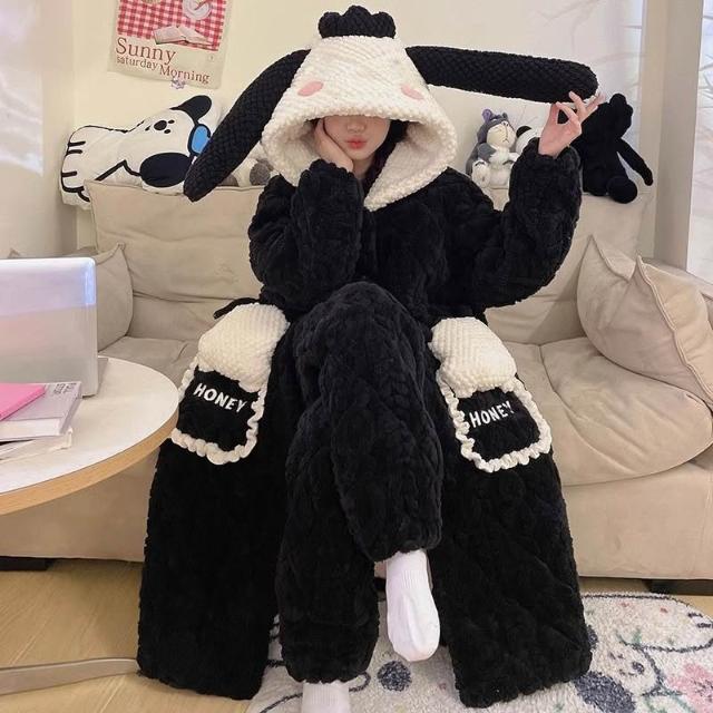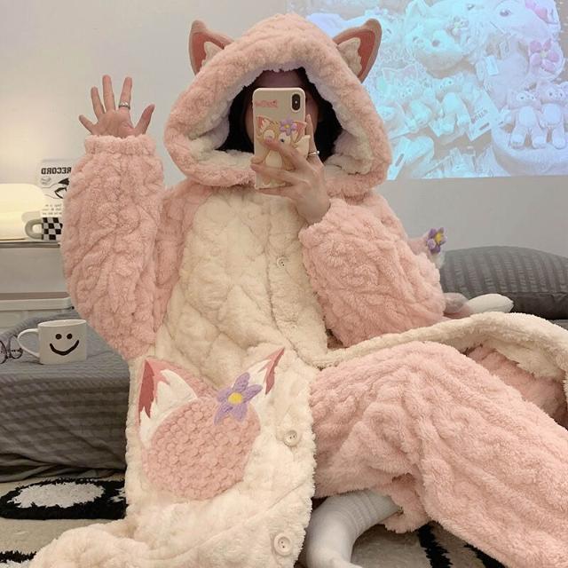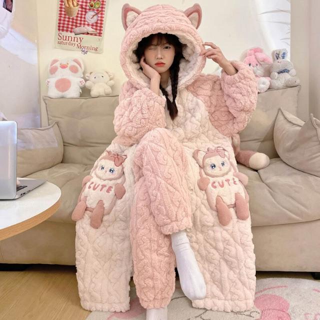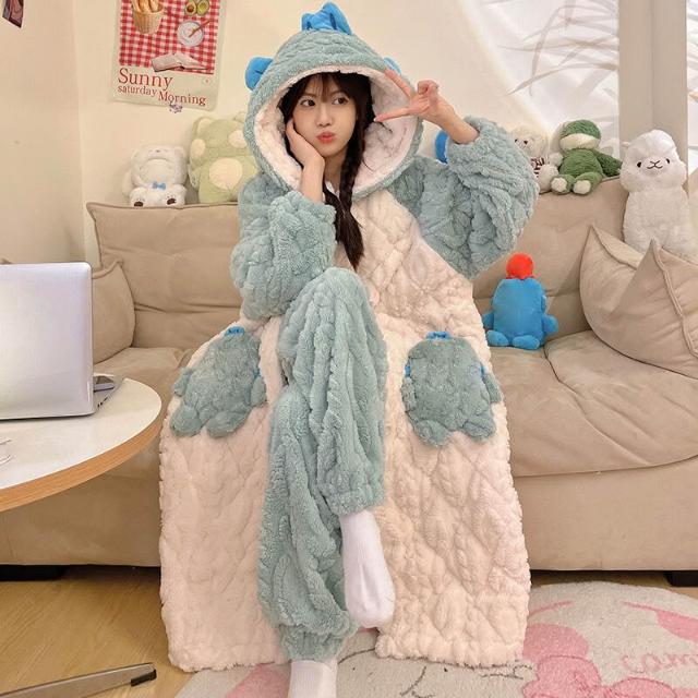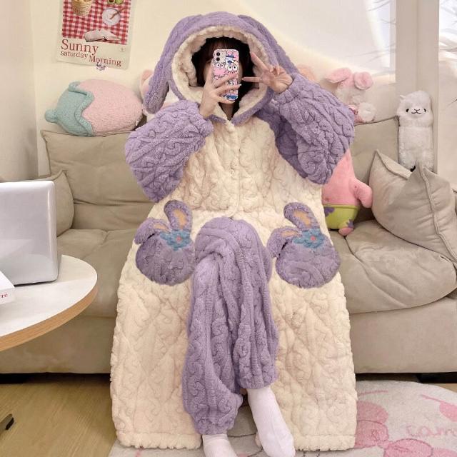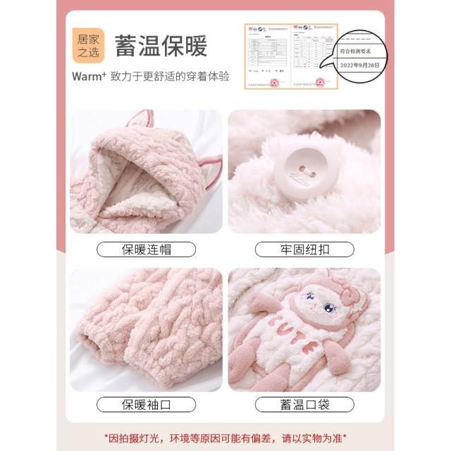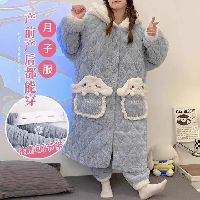 秋冬季睡衣女士三層夾棉襖珊瑚絨長袍款加厚保暖法蘭絨家居服套裝