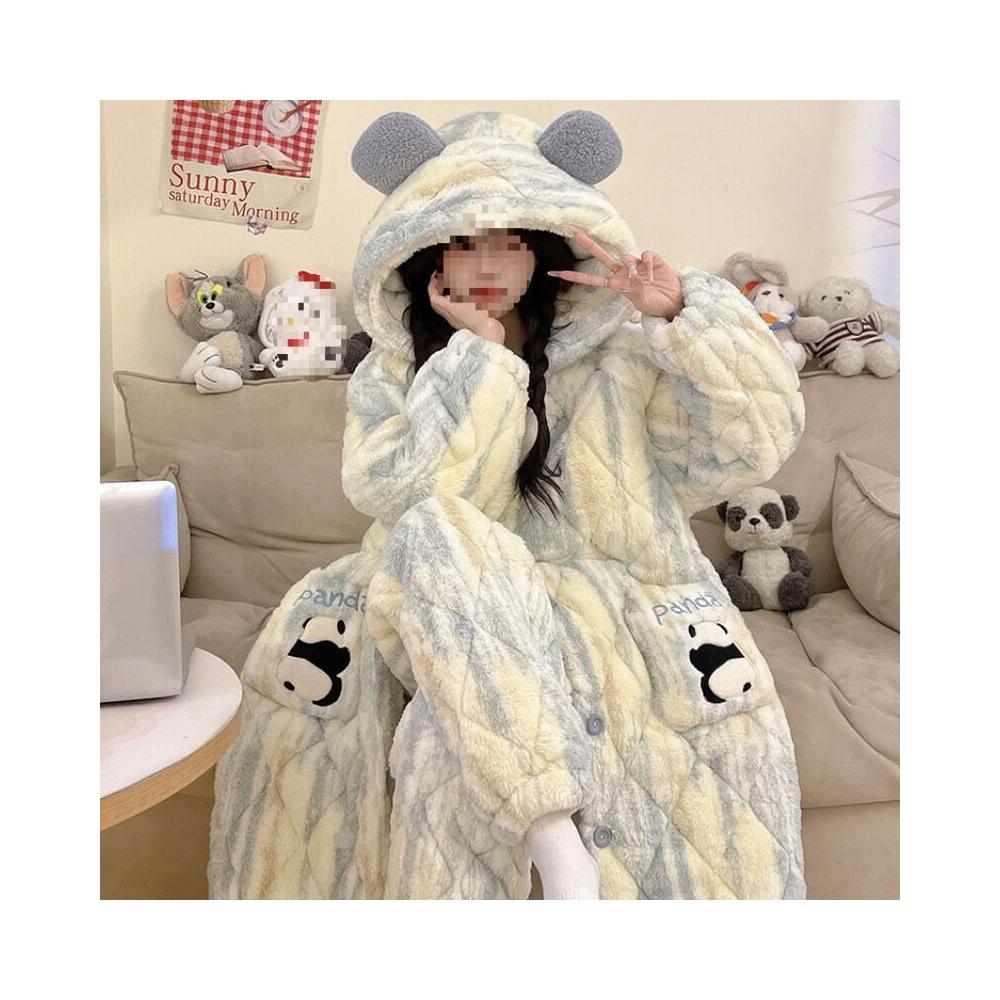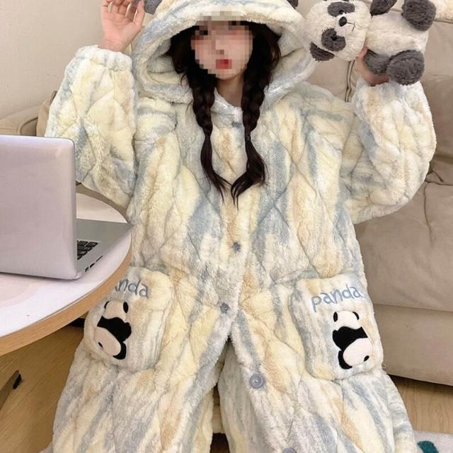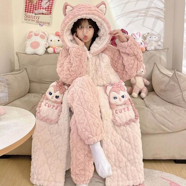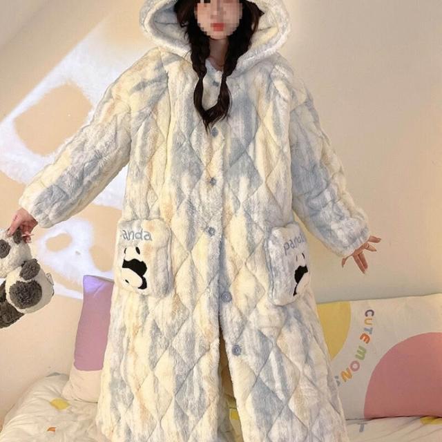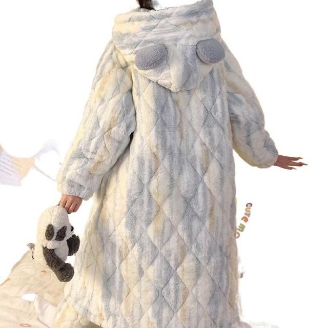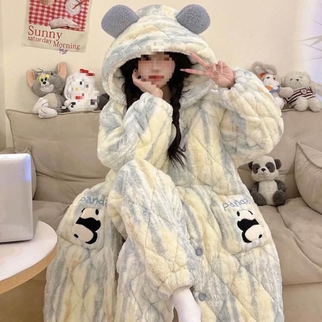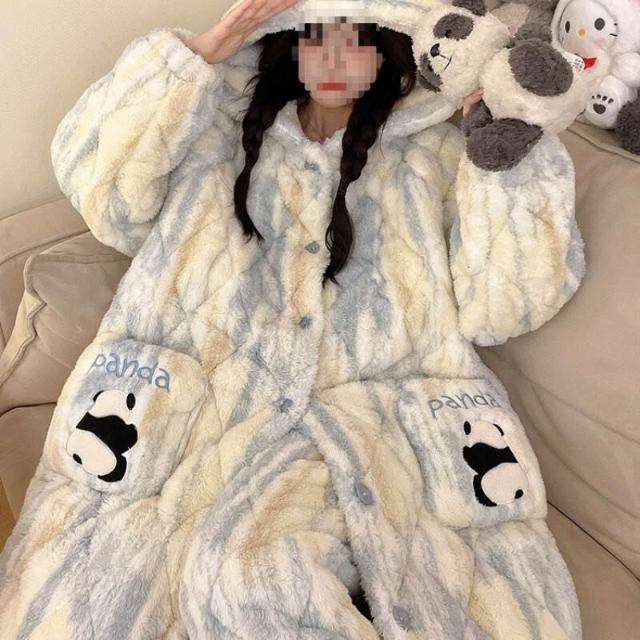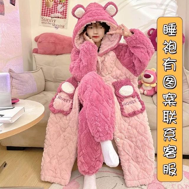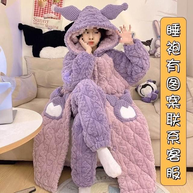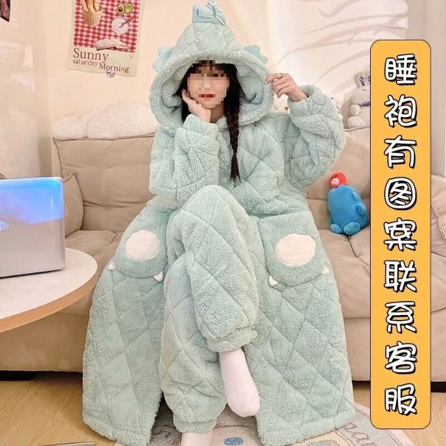 秋冬季珊瑚絨睡衣女款加絨加厚三層夾棉法蘭絨長袍保暖家居服套裝