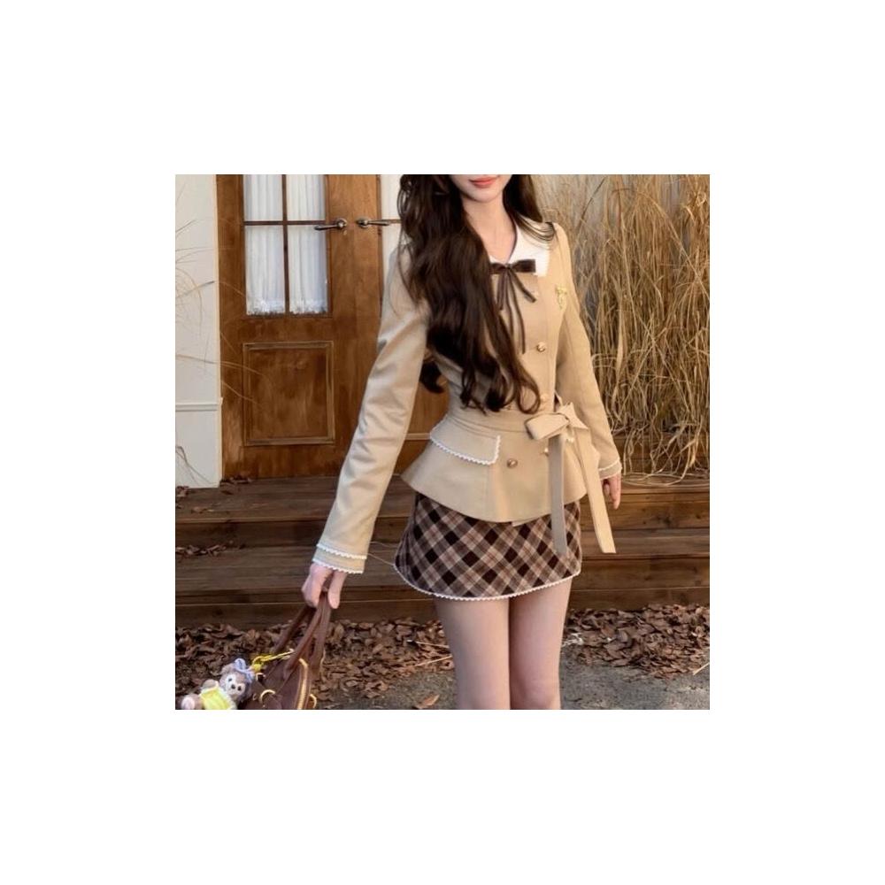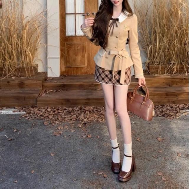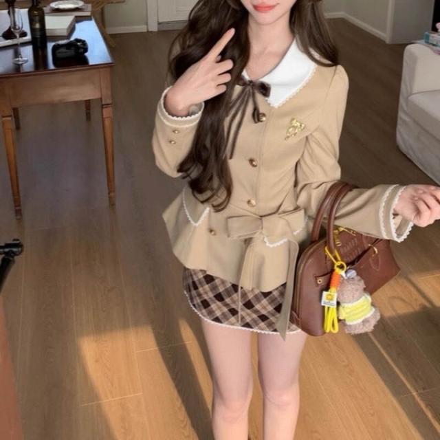格林松塔 法式千金風收腰風衣外套格紋呢子短裙套裝女秋