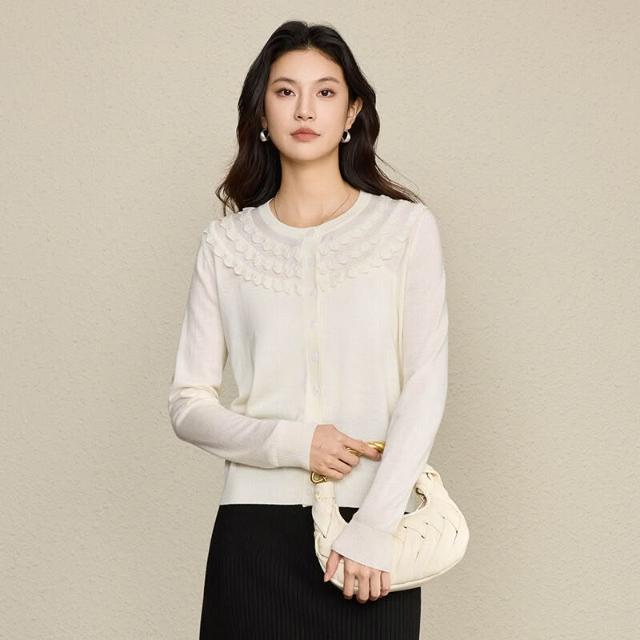 法式優雅氣質拼接木耳邊圓領針織開衫羊毛混紡純色長袖打底毛衣女