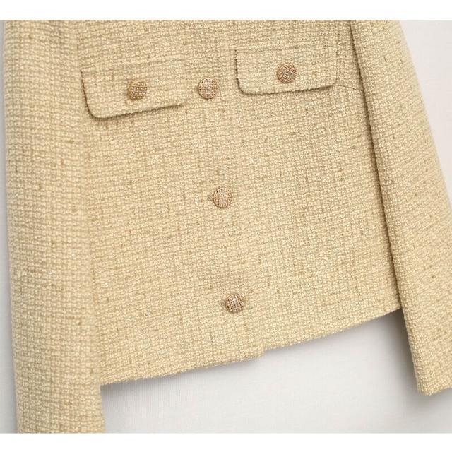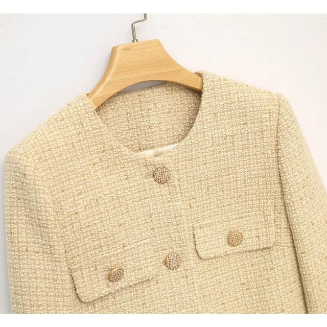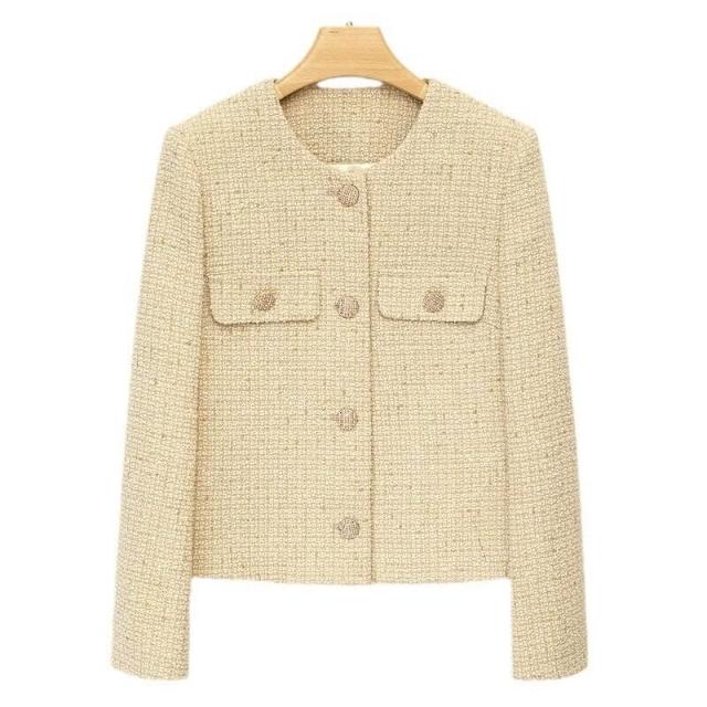 米金色春秋厚款百搭羊毛粗花呢上衣優雅簡約秋冬季女小香風短外套