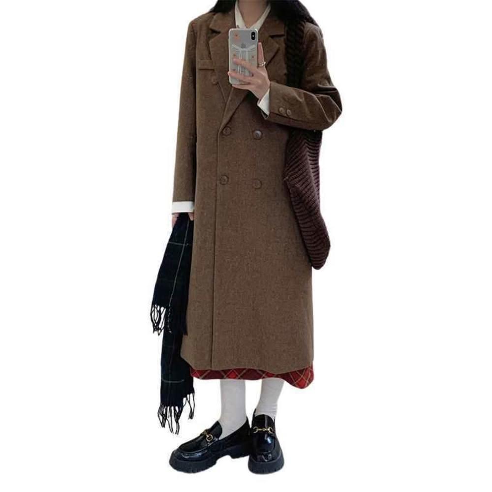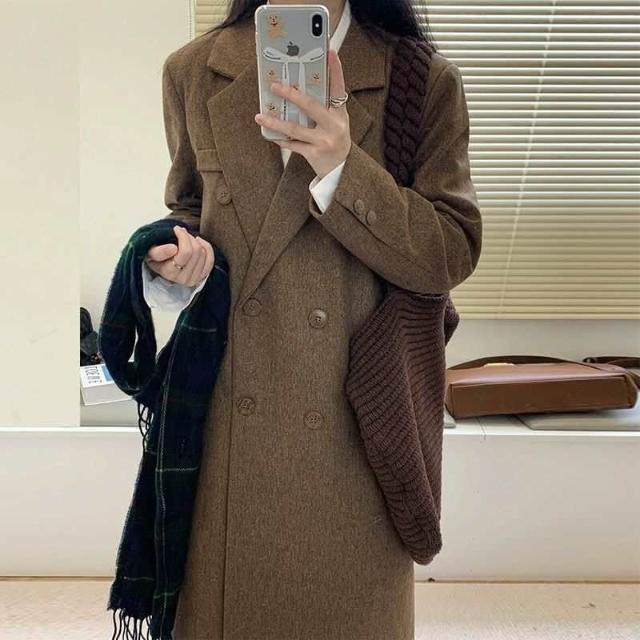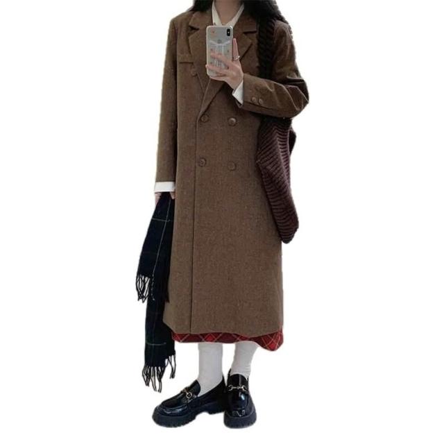 西裝式毛呢大衣女秋冬新款棕色復古顯瘦小個子中長款呢子外套