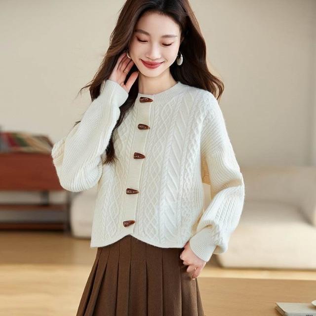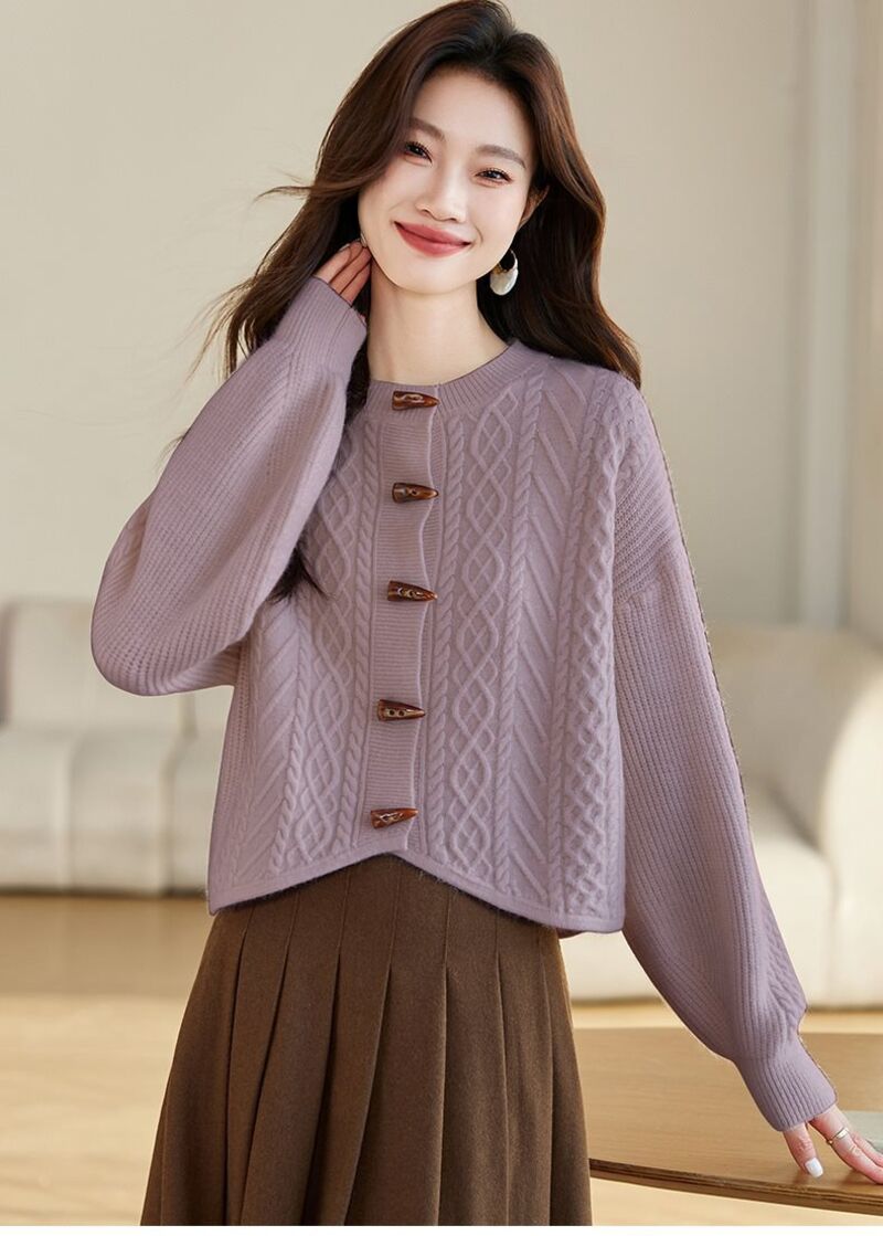 歐萊女裝 復古牛角扣麻花紅色毛衣外套女新款春秋外搭短款軟糯針織開衫