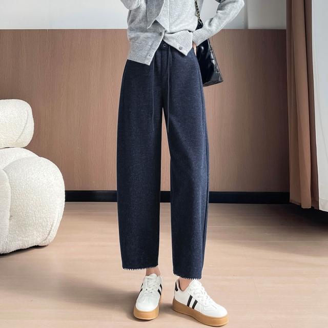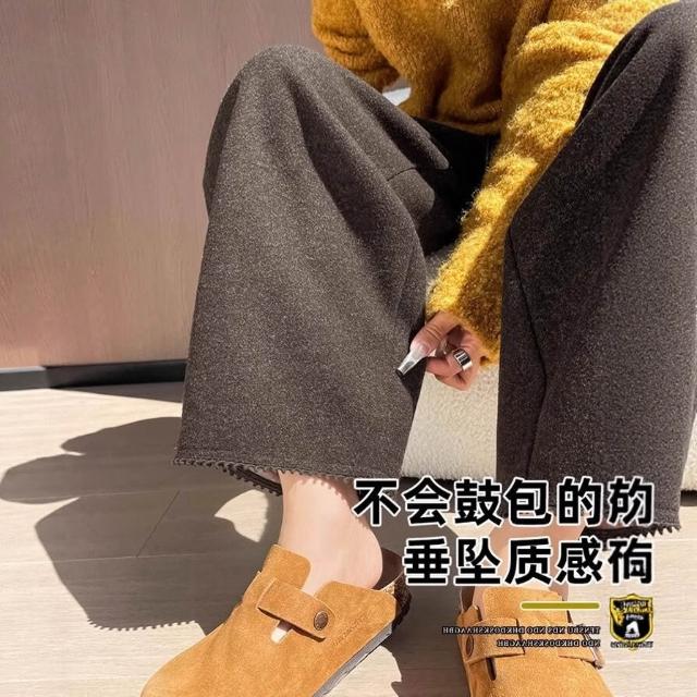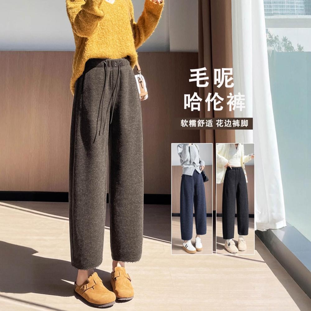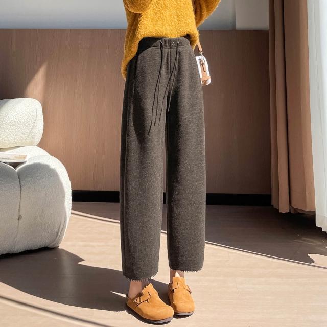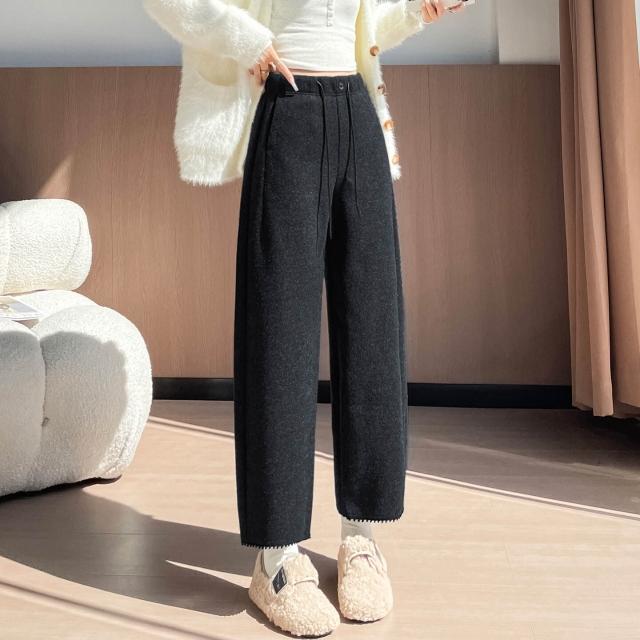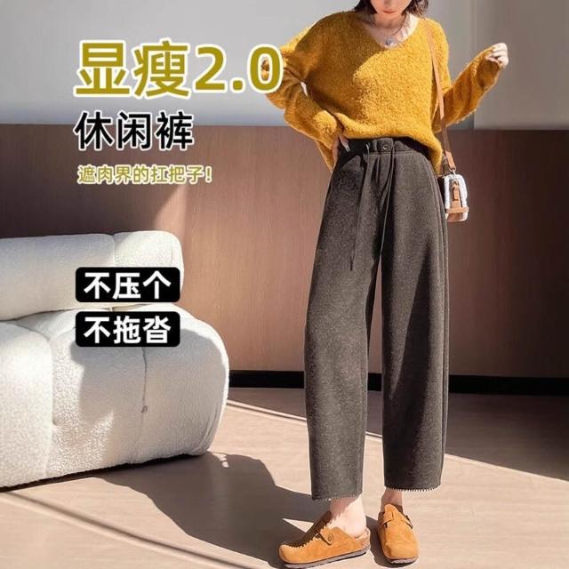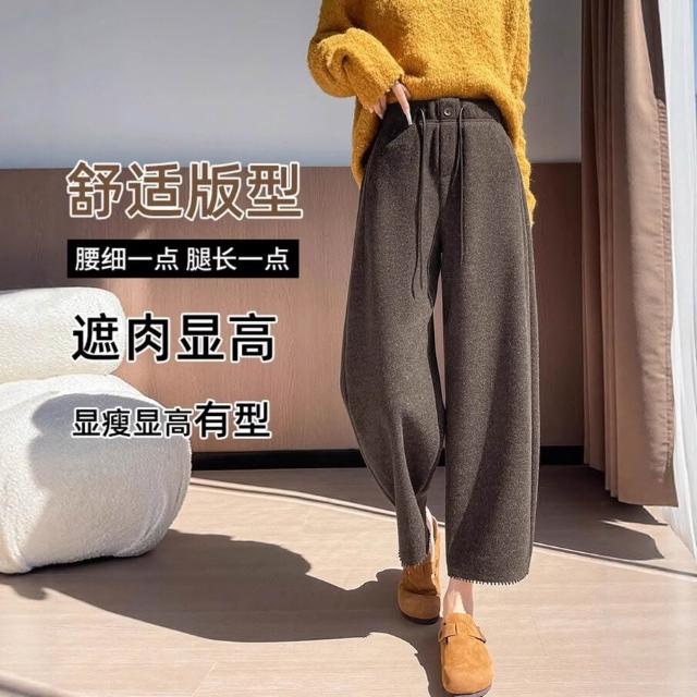 毛呢彎刀褲女秋冬新款九分小個子直筒咖色加絨褲子女冬休閑褲6784