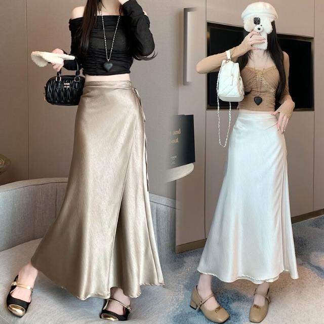歐萊 法式杏色感氣質緞面半身裙女春季2025年新款垂墜感a字包臀裙