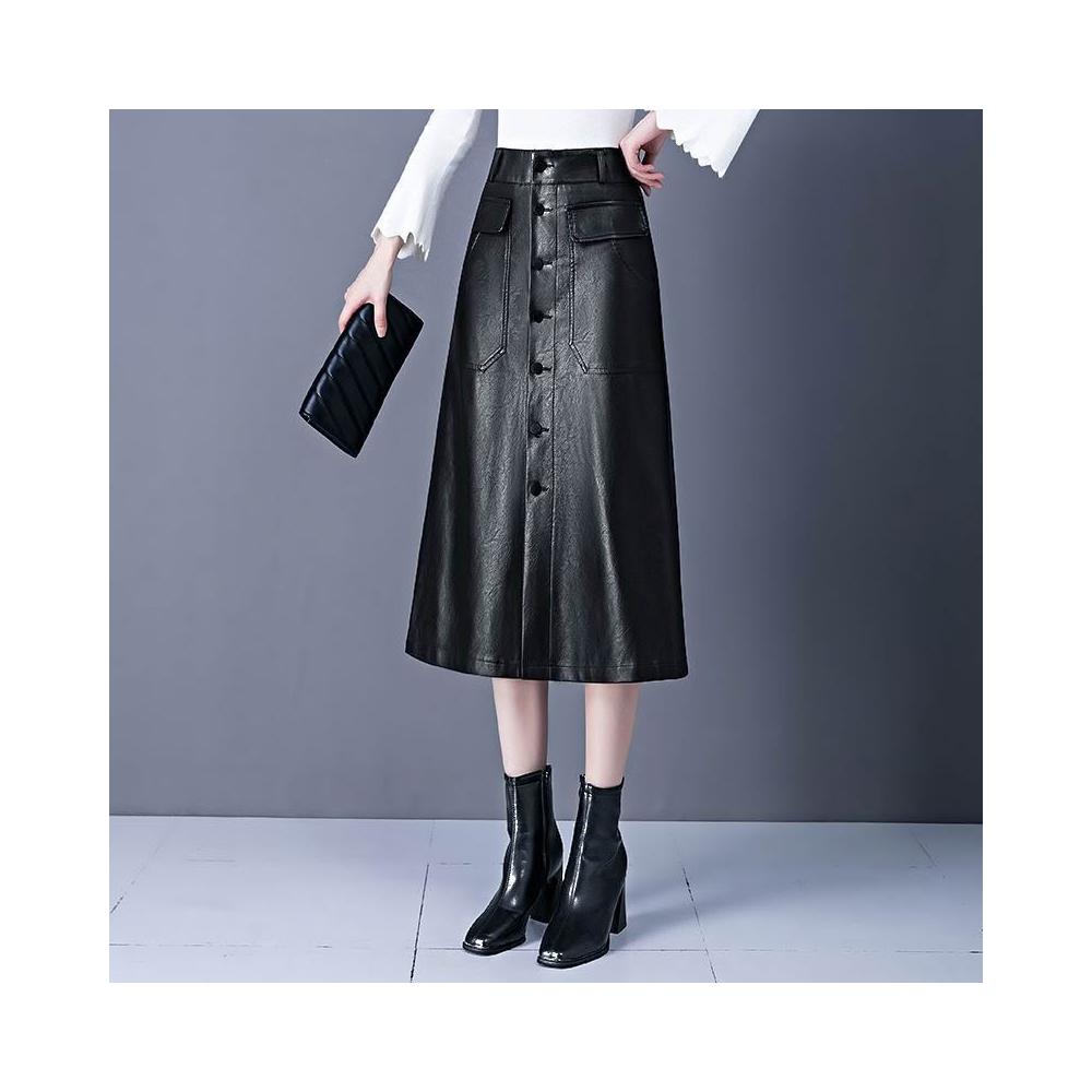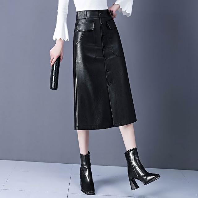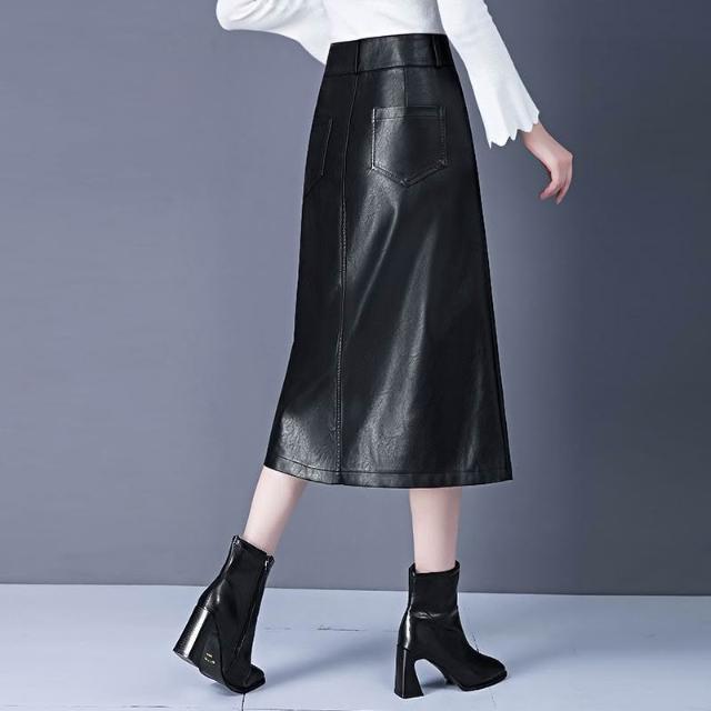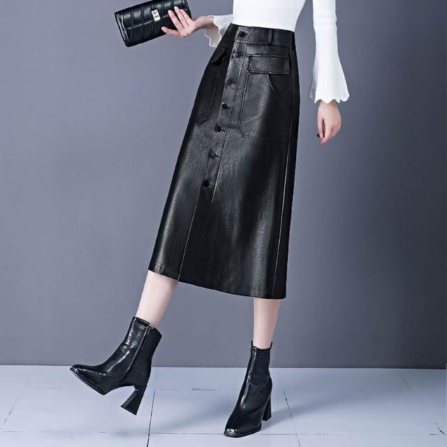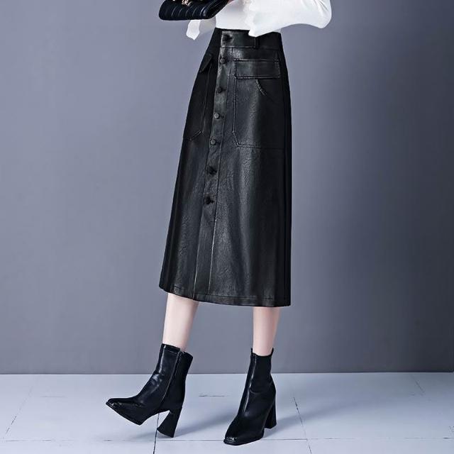 歐萊 皮裙字半身裙女秋冬新款高腰中長款傘裙遮胯顯瘦大擺包臀裙