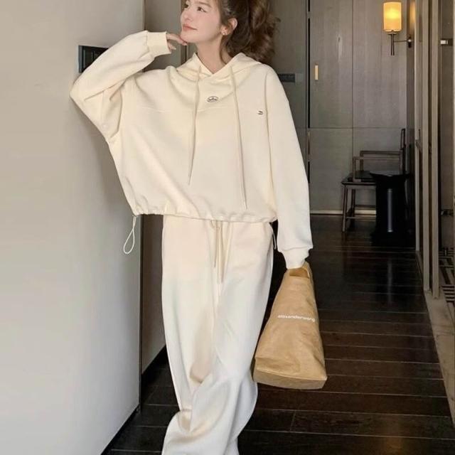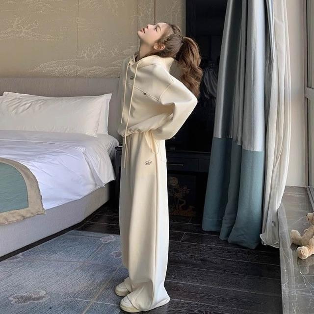 歐萊 米白色時尚運動套裝女學院風連帽衛衣休閑長褲兩件套