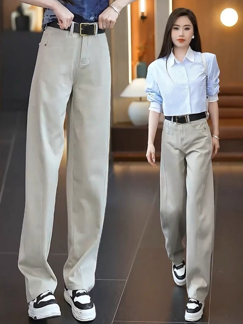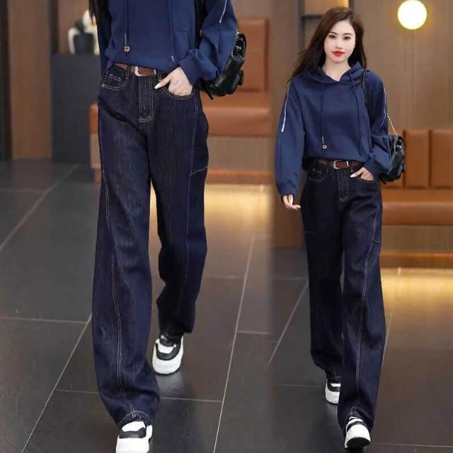 歐萊女裝 美式復古牛仔褲女春秋新款褲子高腰顯瘦窄版闊腿褲寬松休閑直筒褲