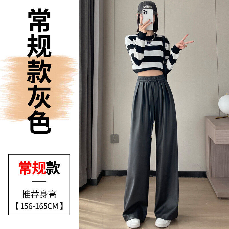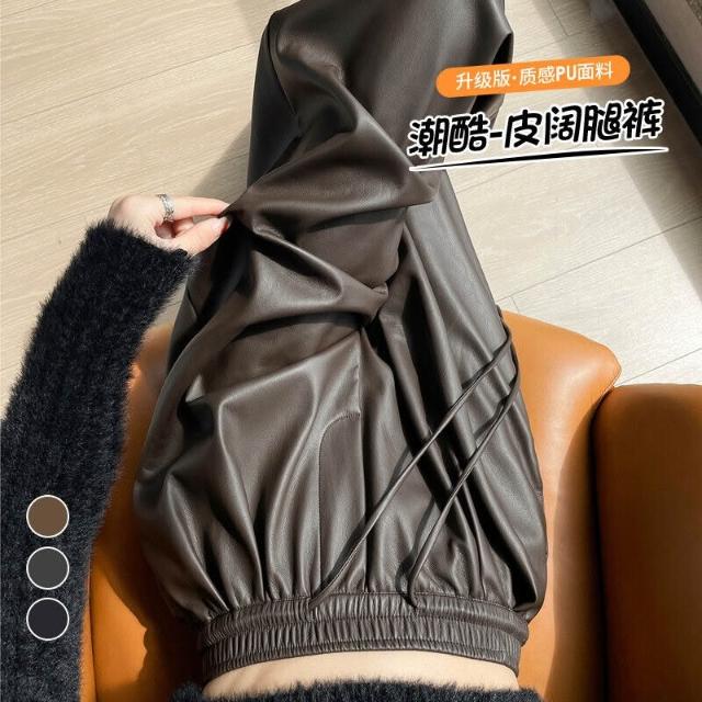 歐萊 皮褲女高腰休閑褲軟皮PU皮潮酷拖地闊腿褲子