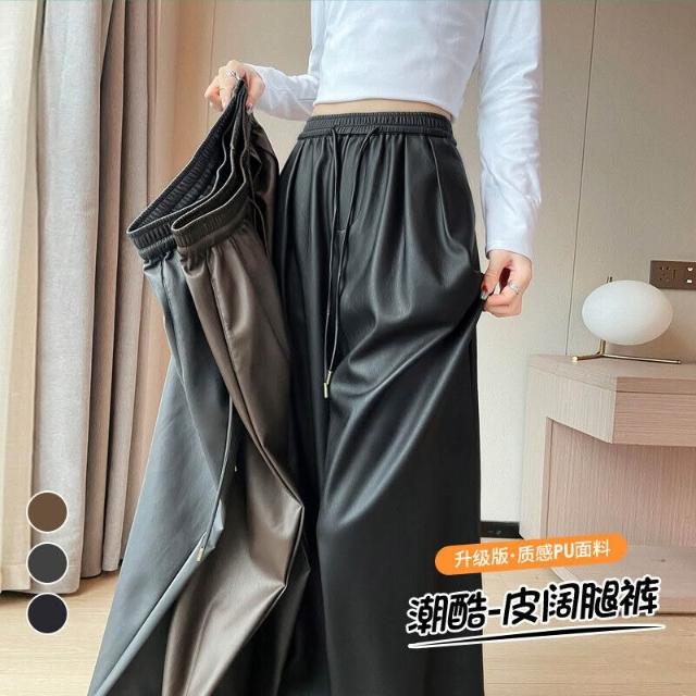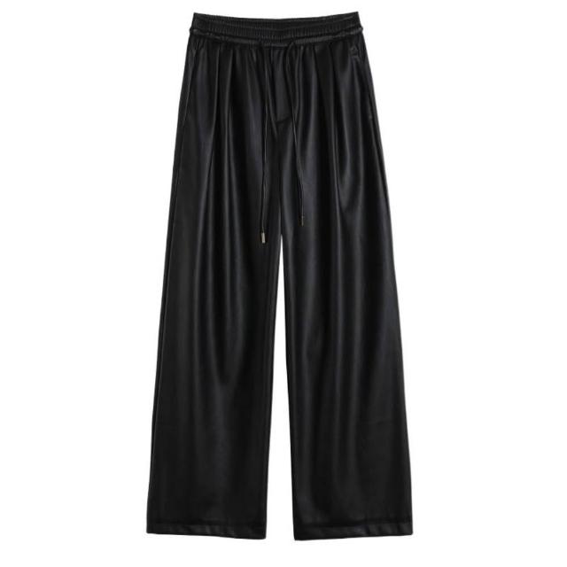 歐萊 皮褲女高腰休閑褲軟皮PU皮潮酷拖地闊腿褲子
