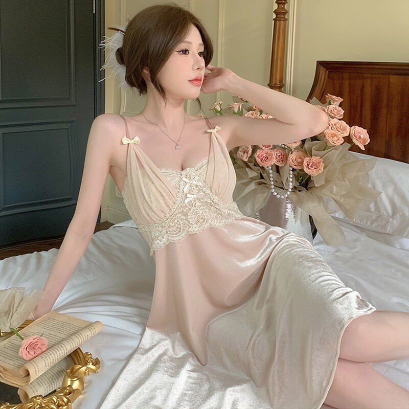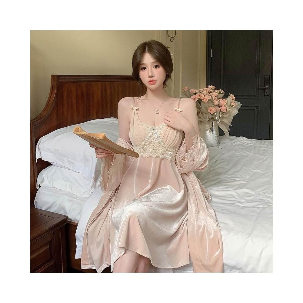 小心機~ 金絲絨性感吊帶睡衣女睡裙睡袍長袖兩件套秋冬季蕾絲邊家居服冬天 超舒適