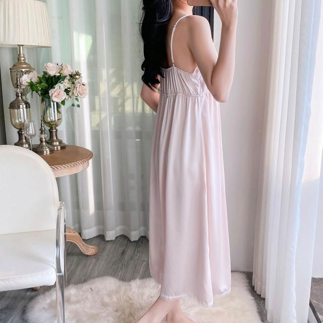 小心機~ 新款睡衣女冰絲長款睡袍法式夏季蕾絲吊帶睡裙帶胸墊兩件套睡袍家 超舒適