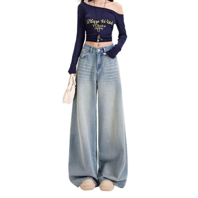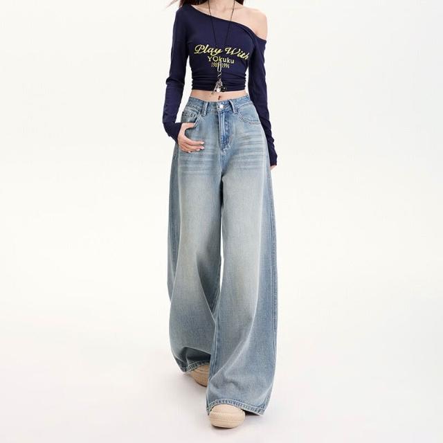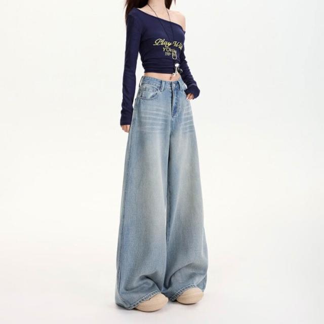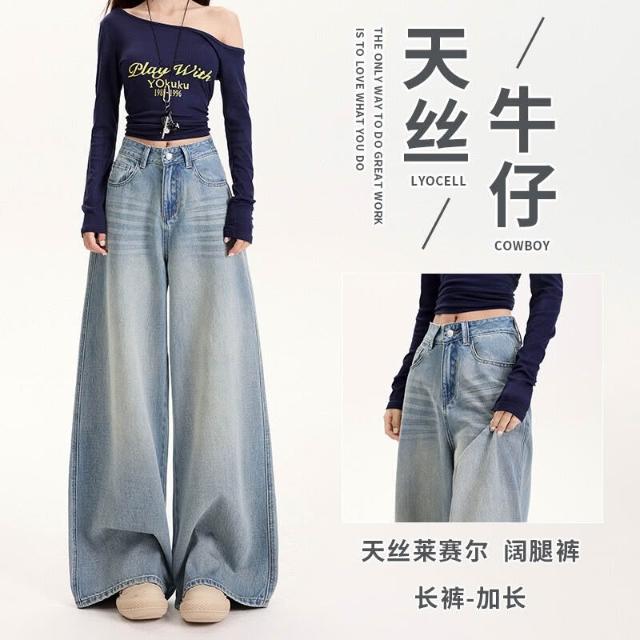 歐萊 懷舊藍天絲a字闊腿牛仔褲女春夏高腰顯瘦遮肉象腿拖地褲