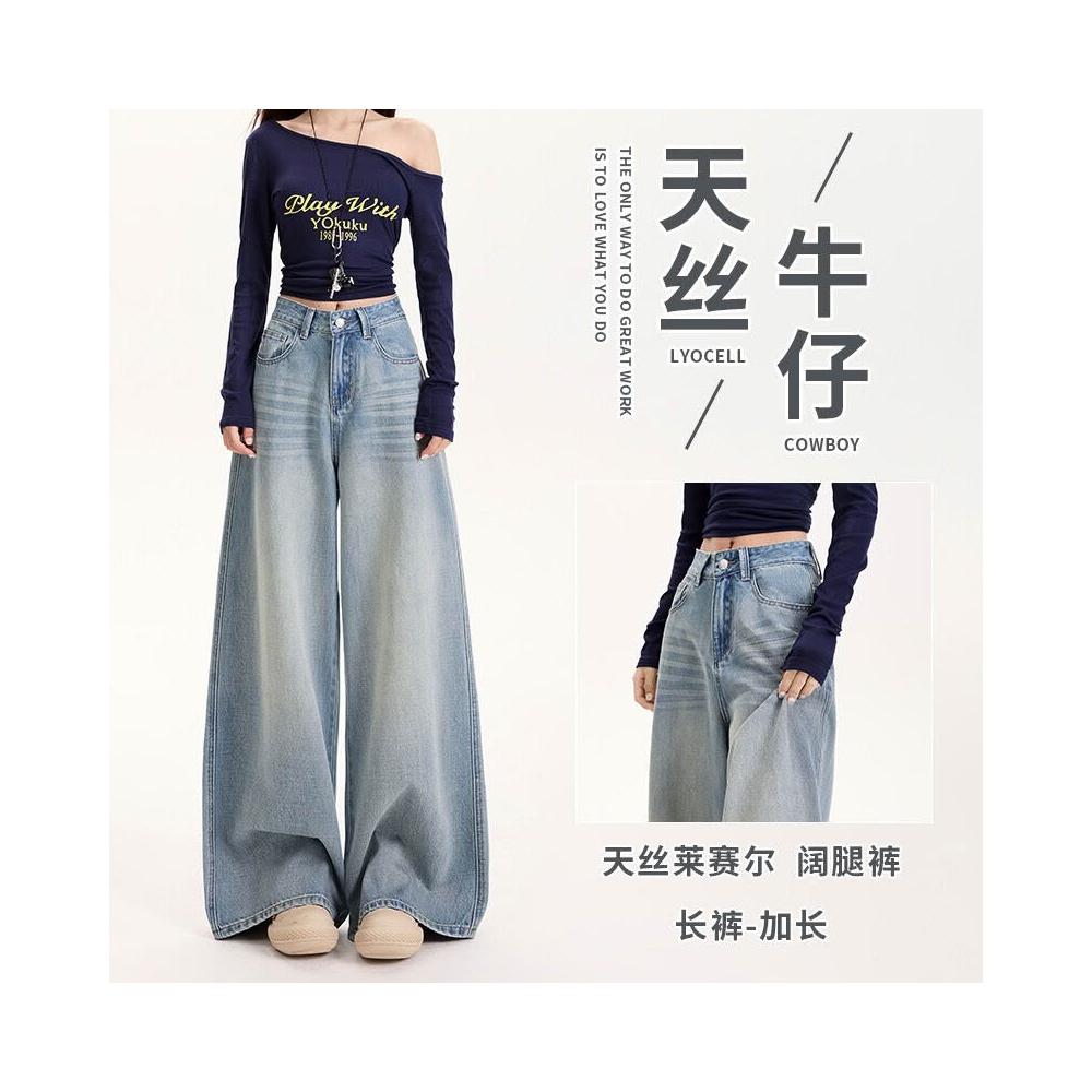 歐萊 懷舊藍天絲a字闊腿牛仔褲女春夏高腰顯瘦遮肉象腿拖地褲