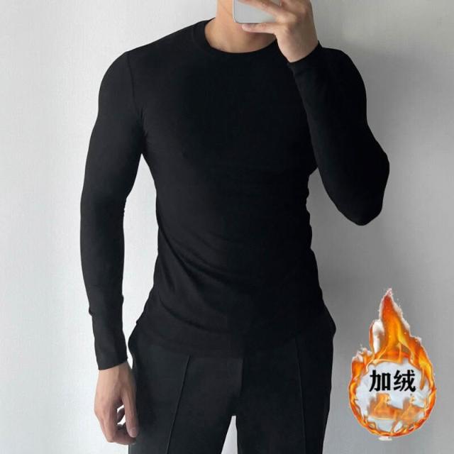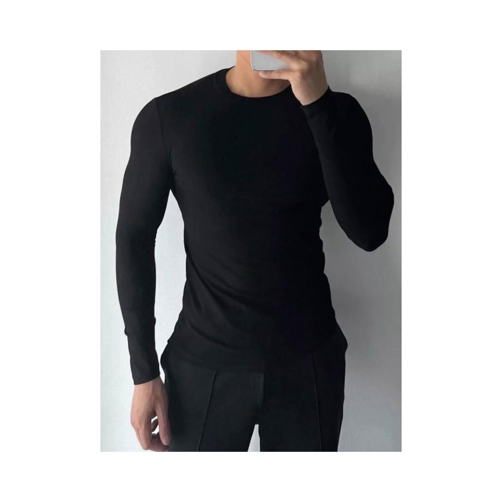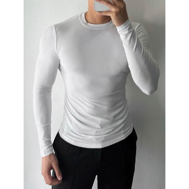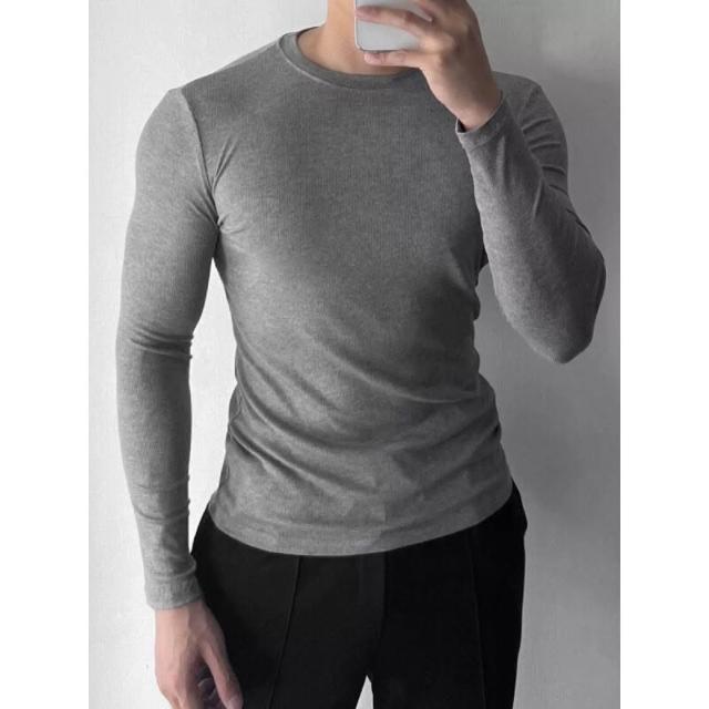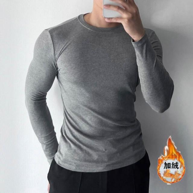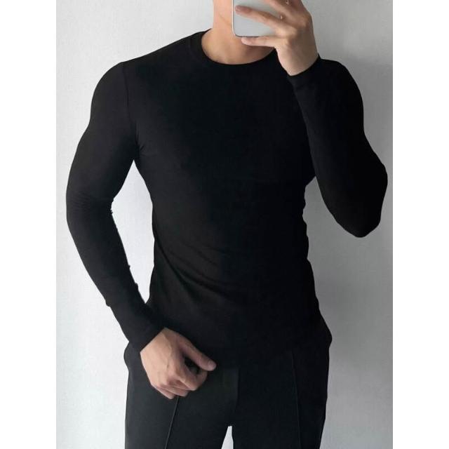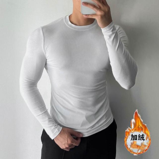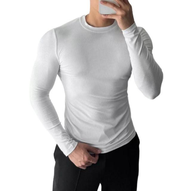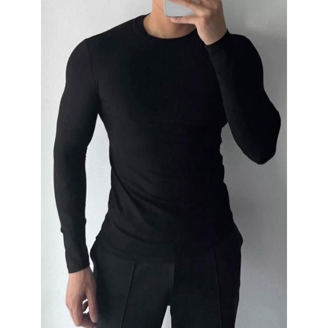 健身必備 男士長袖螺紋T恤休閑圓領健身運動彈力打底衫內搭緊身黑上衣