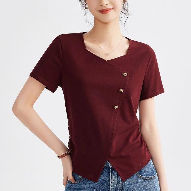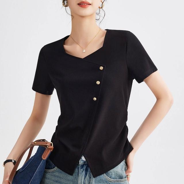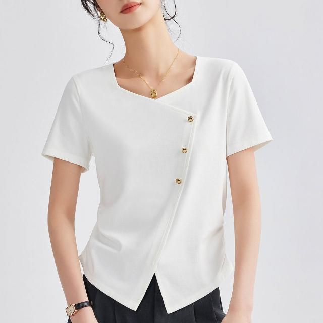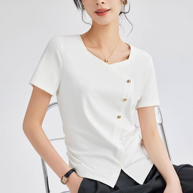 歐萊 正肩方領短袖t恤女夏季高端不規則半袖上衣修身顯瘦體恤