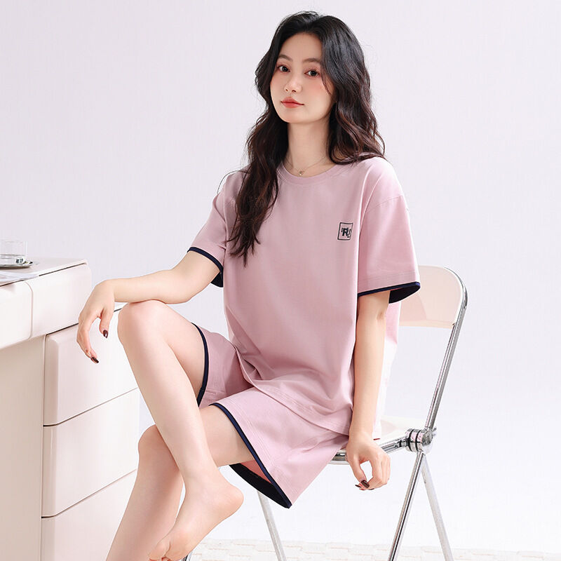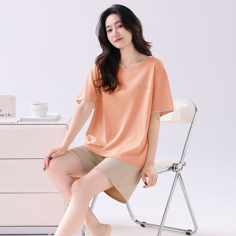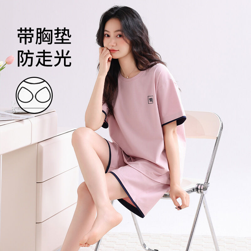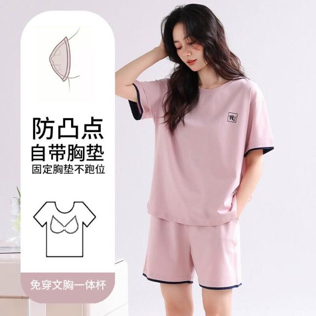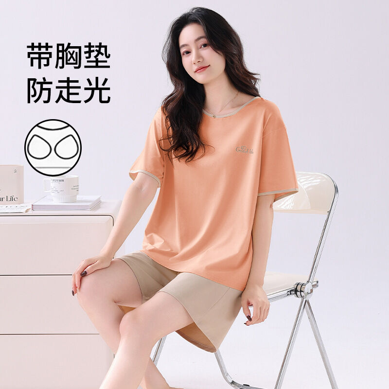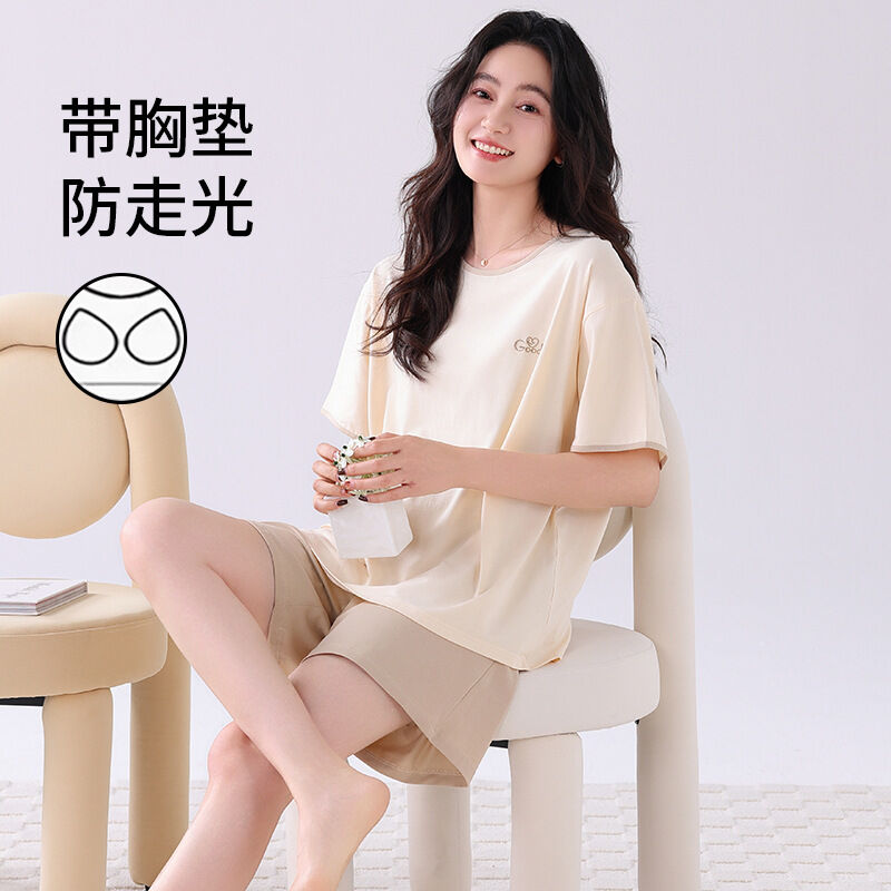 歐萊 帶胸墊睡衣女士夏季涼感莫代爾短袖短褲夏天家居服可外穿休閑套裝