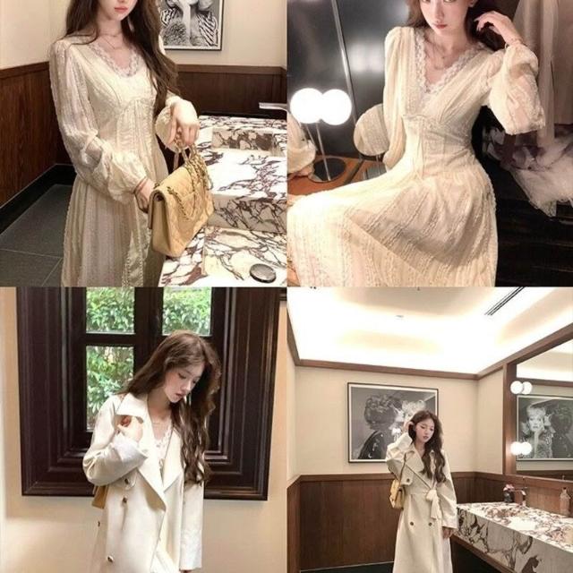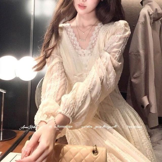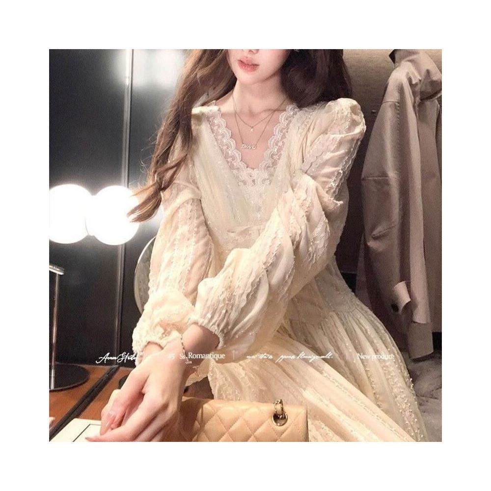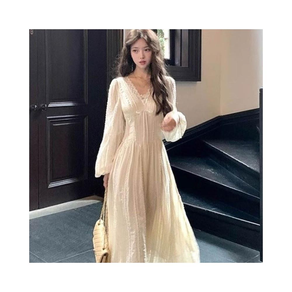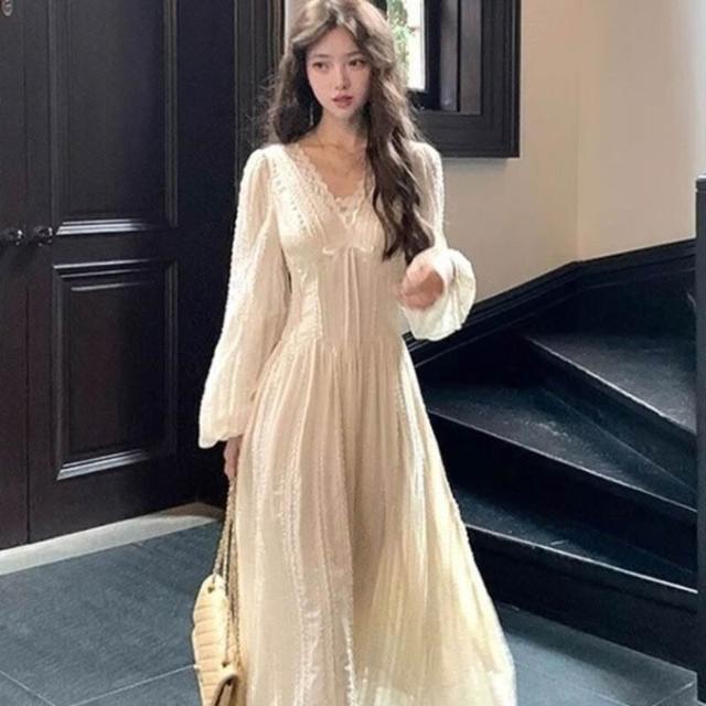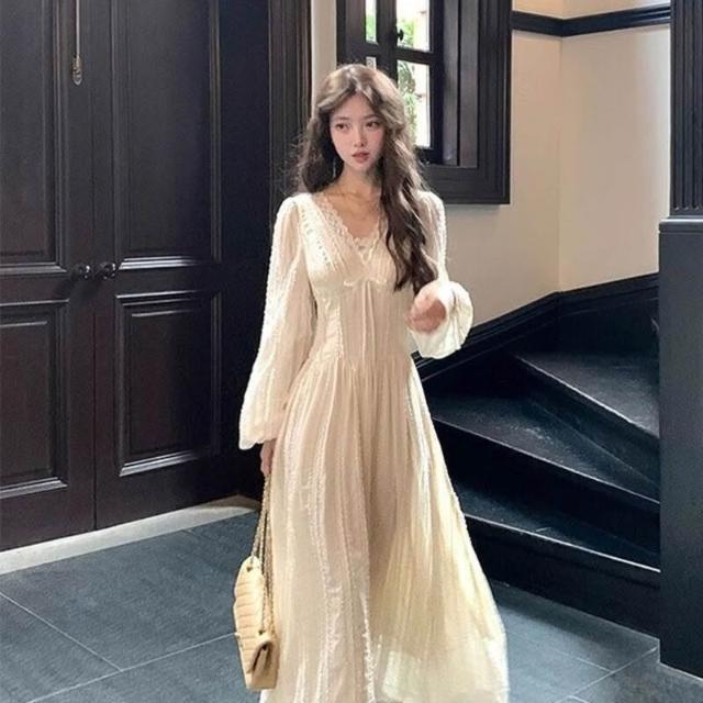 歐萊 長款v領收腰長袖雪紡連衣裙女法式復古氣質顯瘦a字裙子