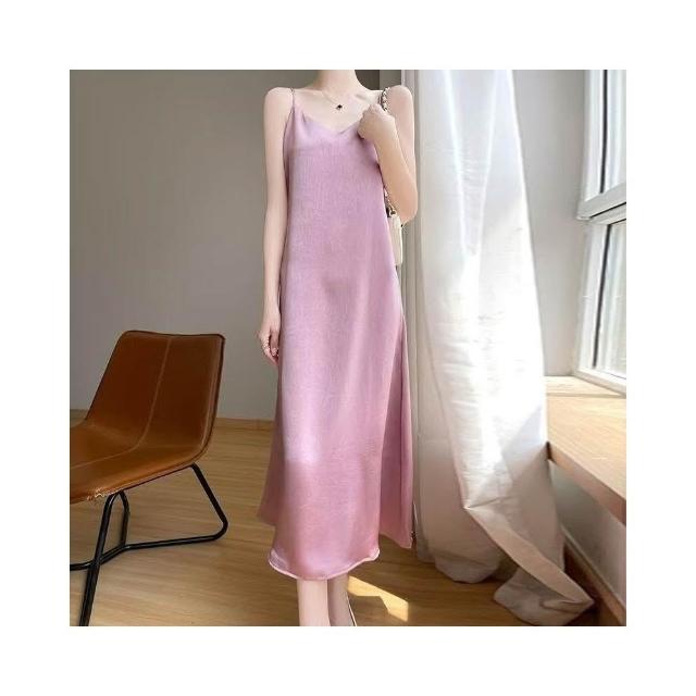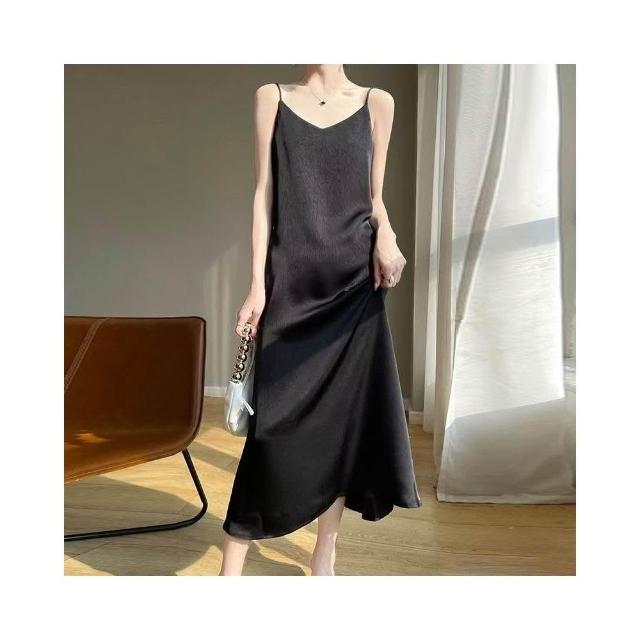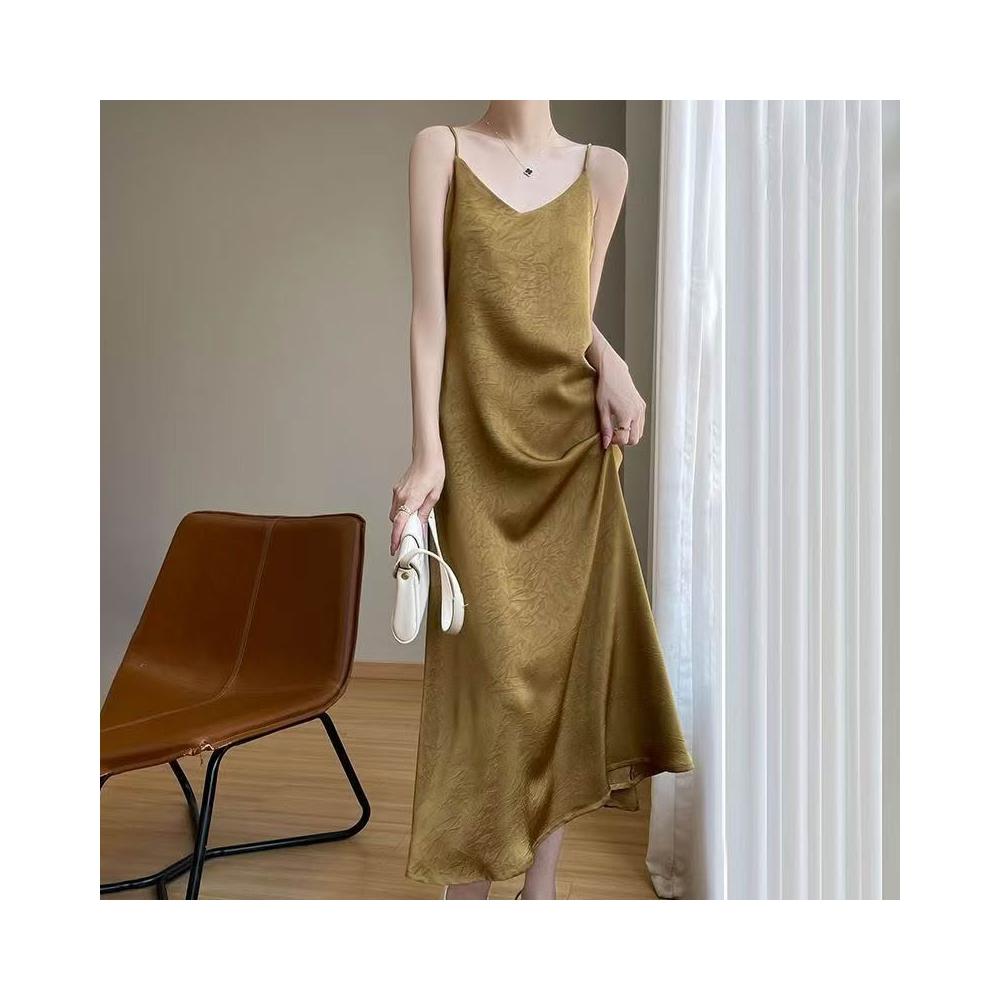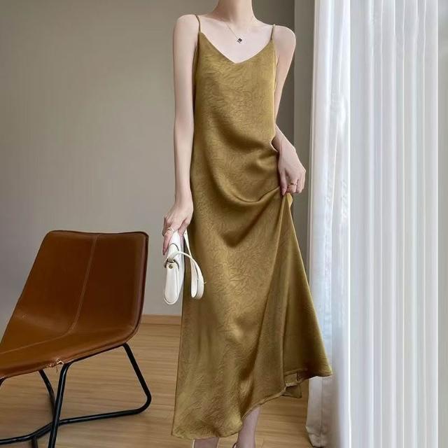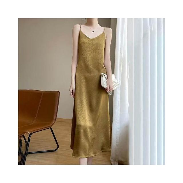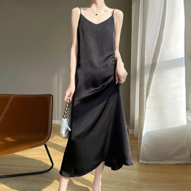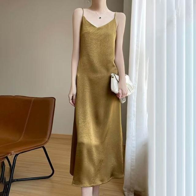歐萊 醋酸緞面提花吊帶裙連衣裙吊帶裂紋夏季長款氣質顯瘦高級長裙