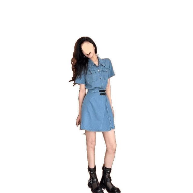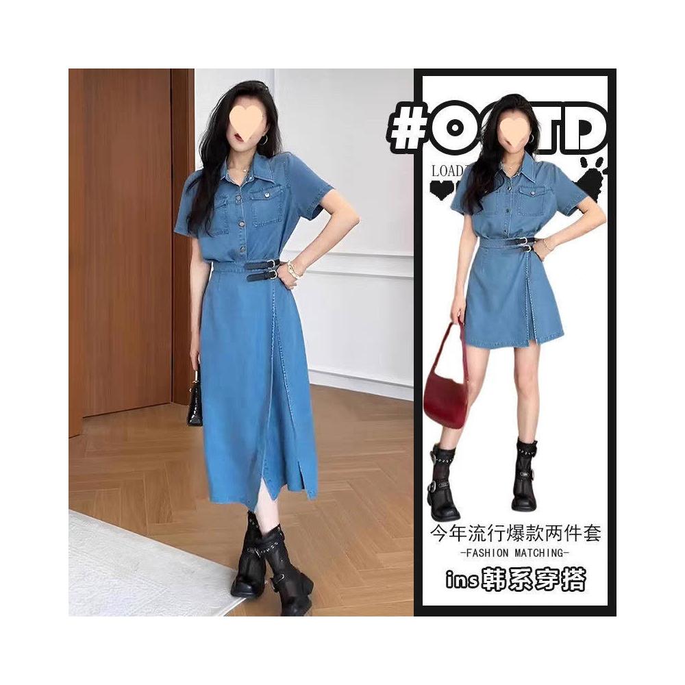 歐萊 復古氣質假兩件短袖牛仔連衣裙女夏季新款設計感收腰a字長裙