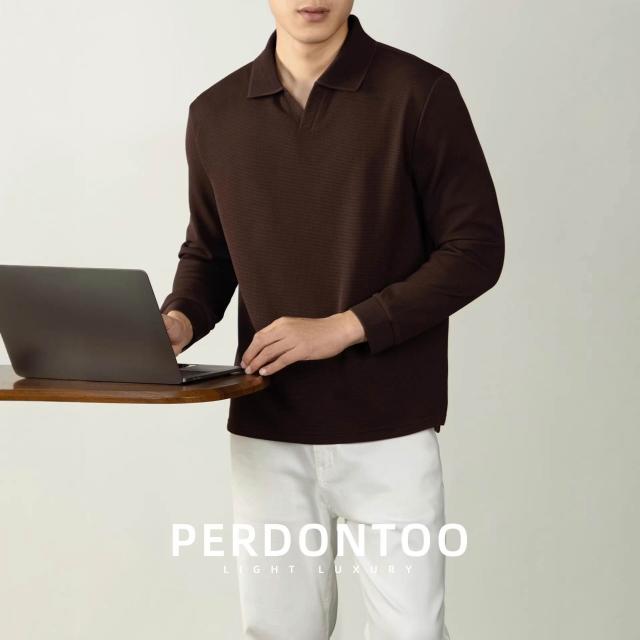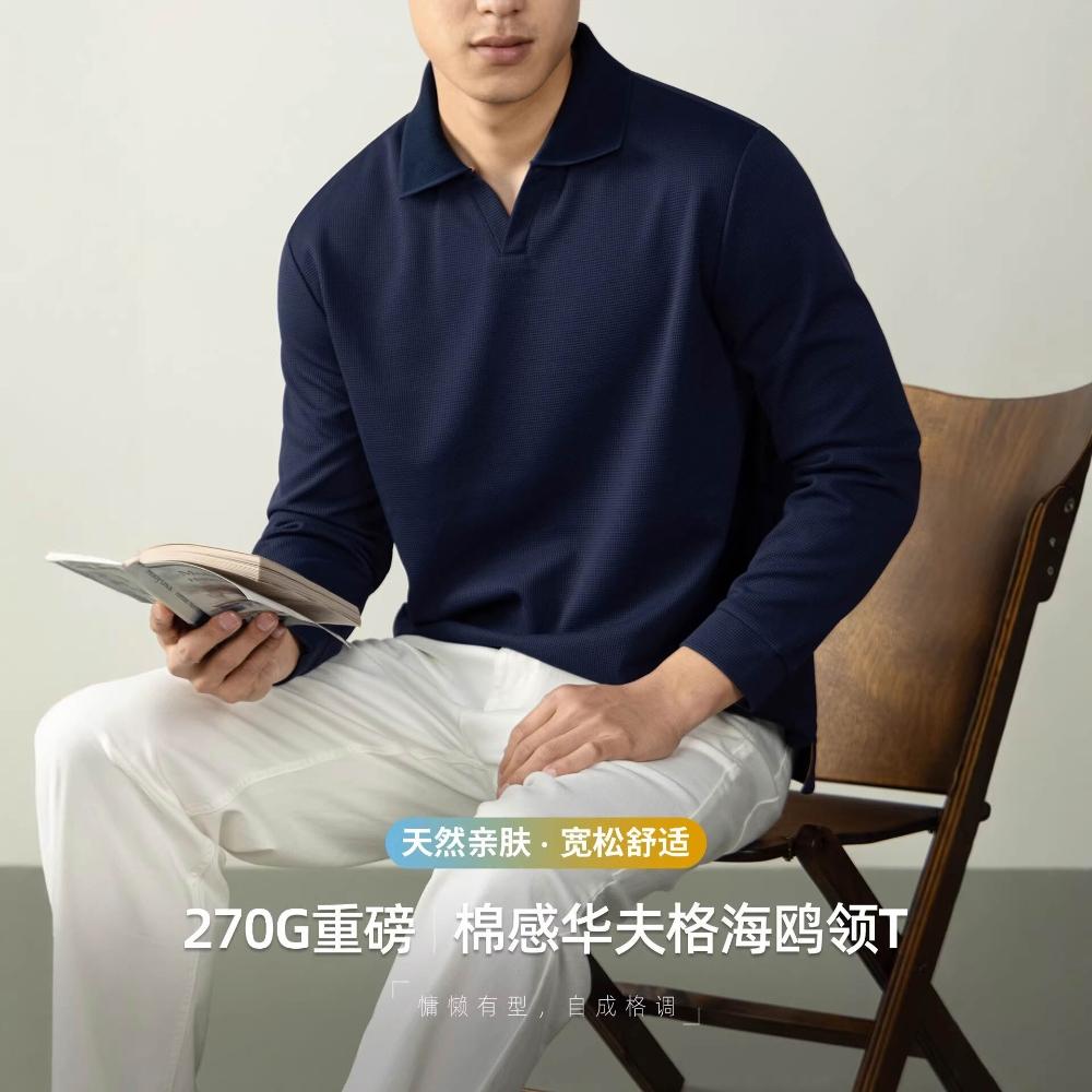 新貴row風極簡華夫格無扣海鷗領長袖T桖男通勤商務休閑POLO衫