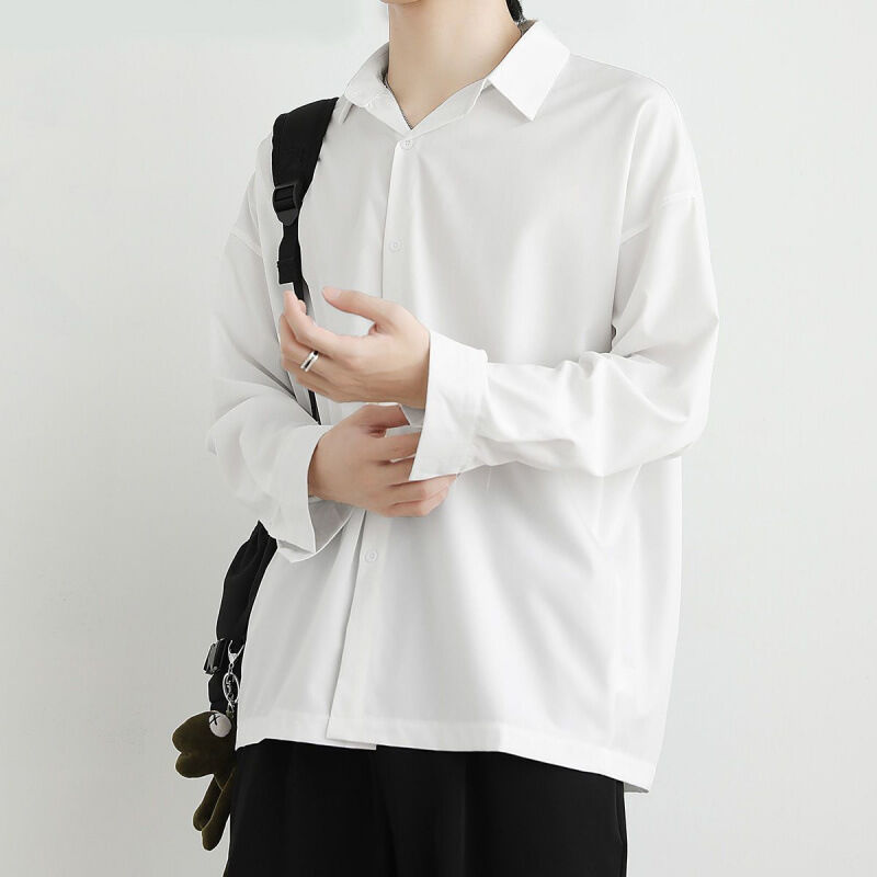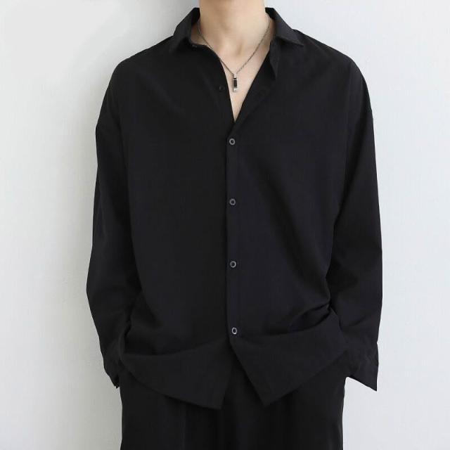 歐萊 免燙冰絲黑色襯衫男士長袖春夏新款垂感寬松白襯衣外套休閑套裝
