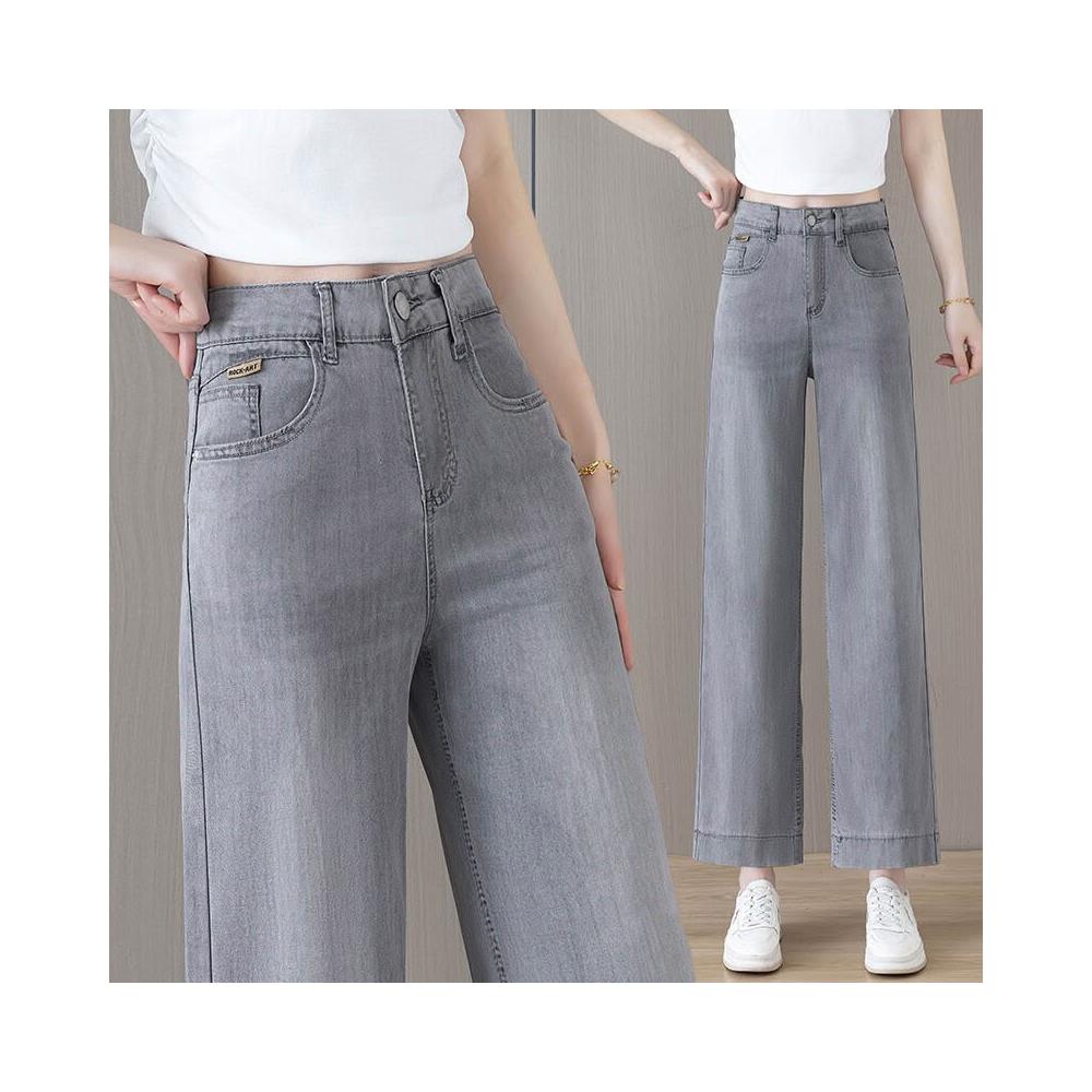歐萊涼感透氣 八分九分灰色天絲薄款直筒牛仔褲女夏寬松高腰顯瘦小個子闊腿筒褲
