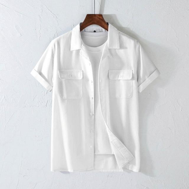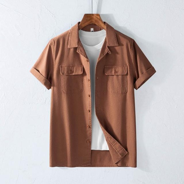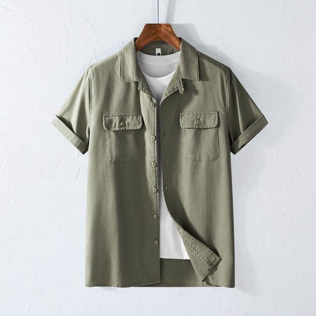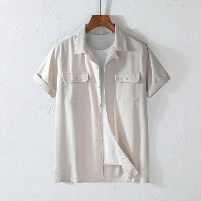 薄款 棉麻短袖古巴領男士襯衫口袋美式復古翻領工裝透氣襯衣日系加大碼