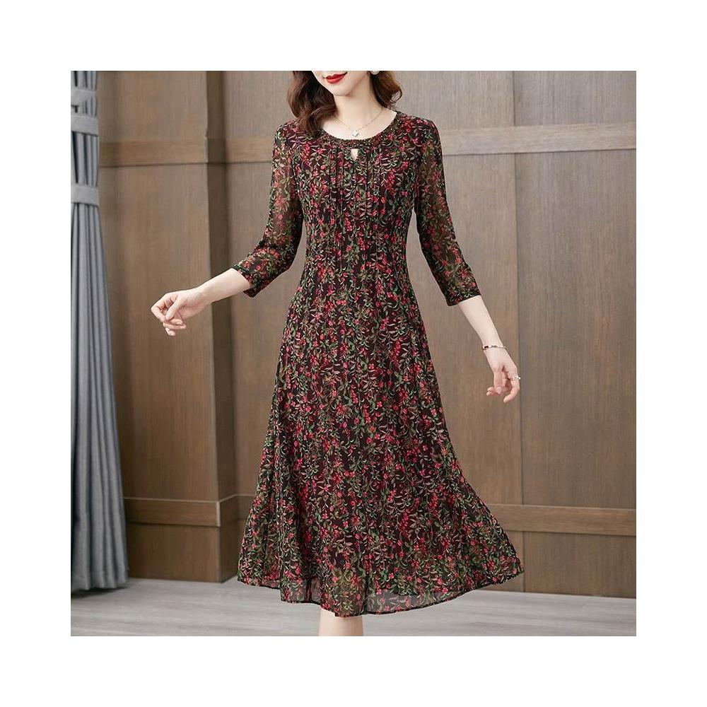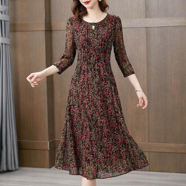 高端網紗 收腰顯瘦 女2026夏新 時尚洋氣 媽媽裝 碎花 七分袖 連衣裙