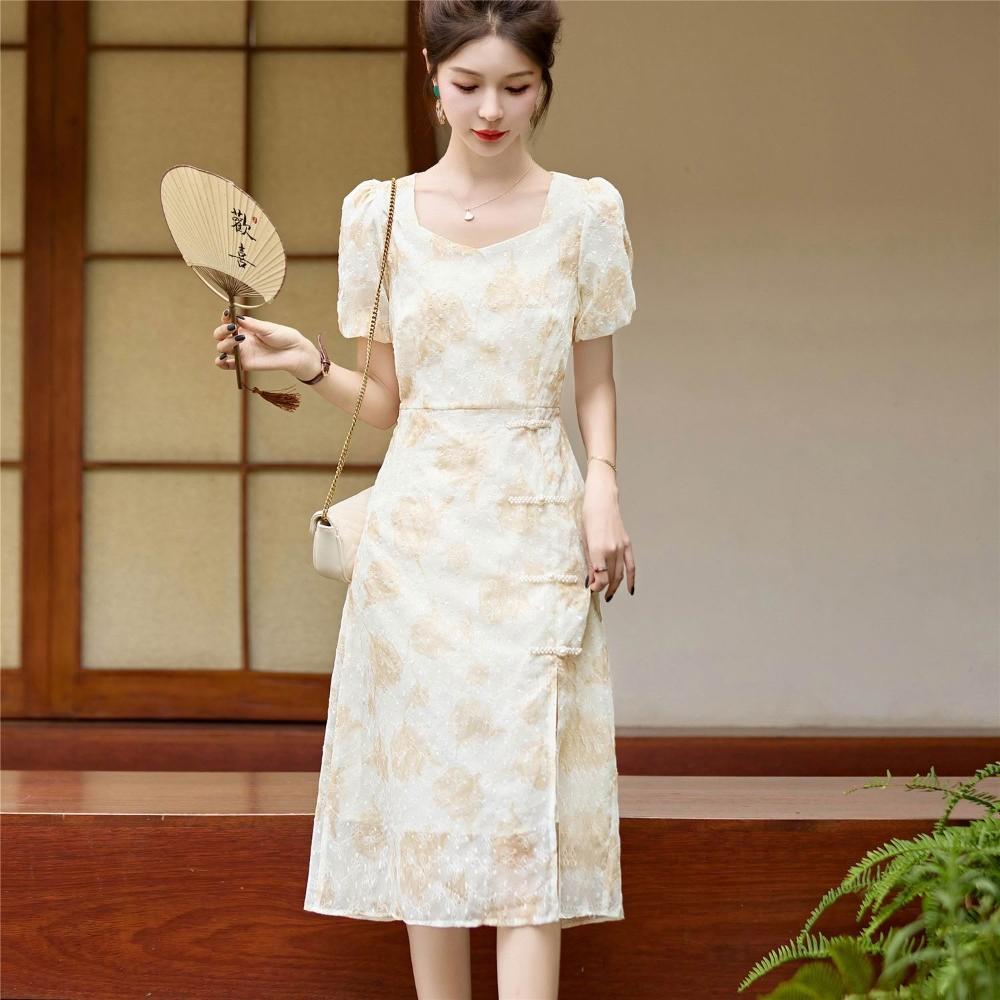 新中式 雪紡連衣裙 新款泡泡袖 時尚收腰 百搭中長款裙子