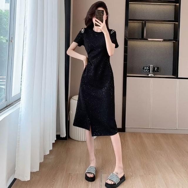 法式黑色休閑 修身連衣裙 收腰顯瘦 中長款 氣質開叉裙子