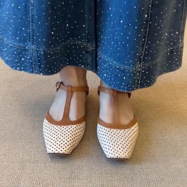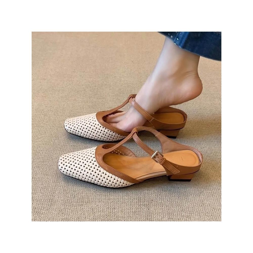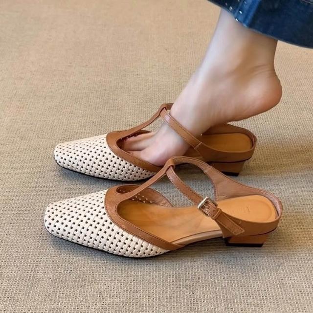 歐萊 羊皮~復古軟底方頭拼色T型帶編織镂空涼拖鞋女真皮通勤粗跟包頭拖