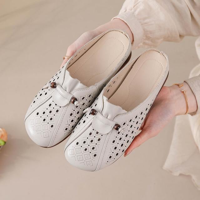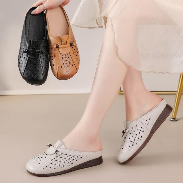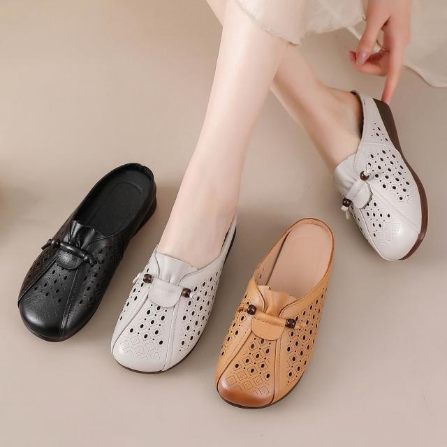 歐萊 包頭半拖鞋女夏外穿2026新款镂空涼鞋拖真皮軟底牛筋底中年媽媽鞋