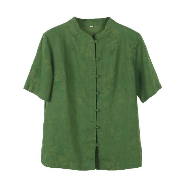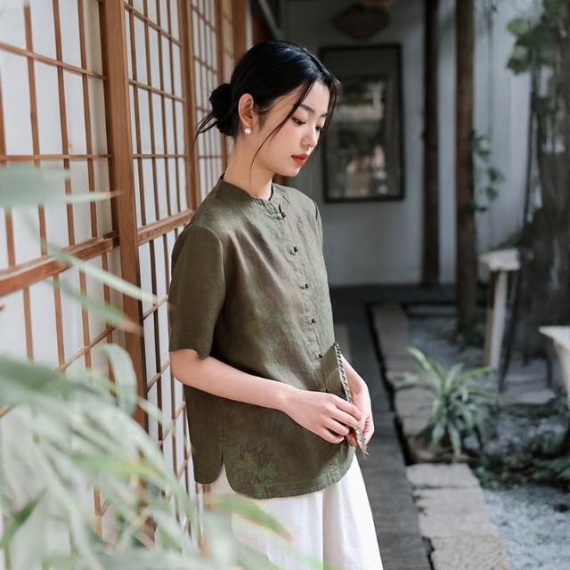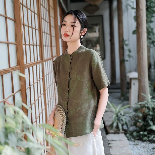 新中式女裝夏季新款印花亞麻襯衫女復古風高端立領女士襯衣