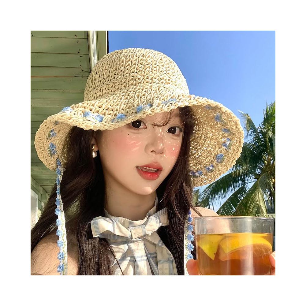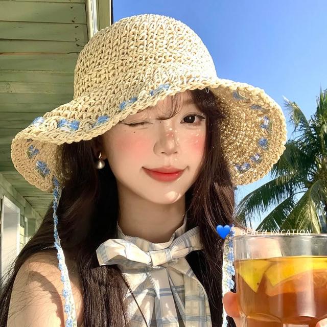 歐萊 碎花綁帶編織草帽女夏季大帽檐遮陽防曬帽子海邊沙灘度假風漁夫帽