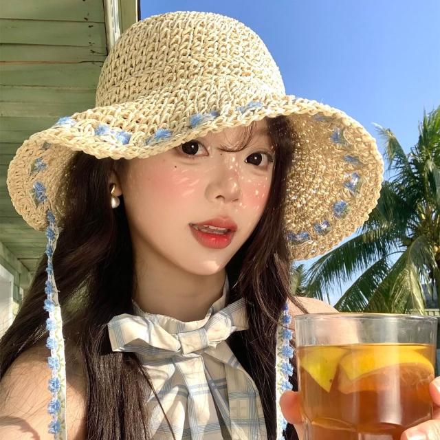 歐萊 碎花綁帶編織草帽女夏季大帽檐遮陽防曬帽子海邊沙灘度假風漁夫帽