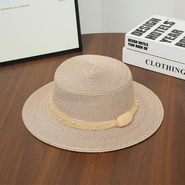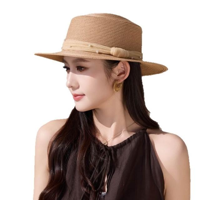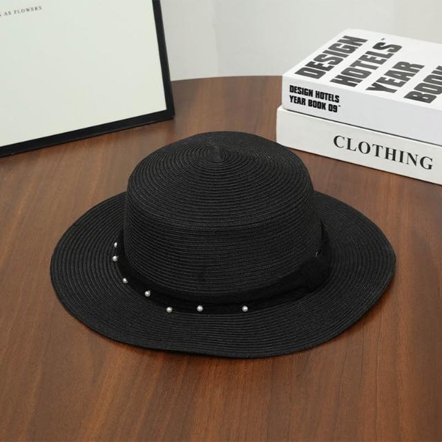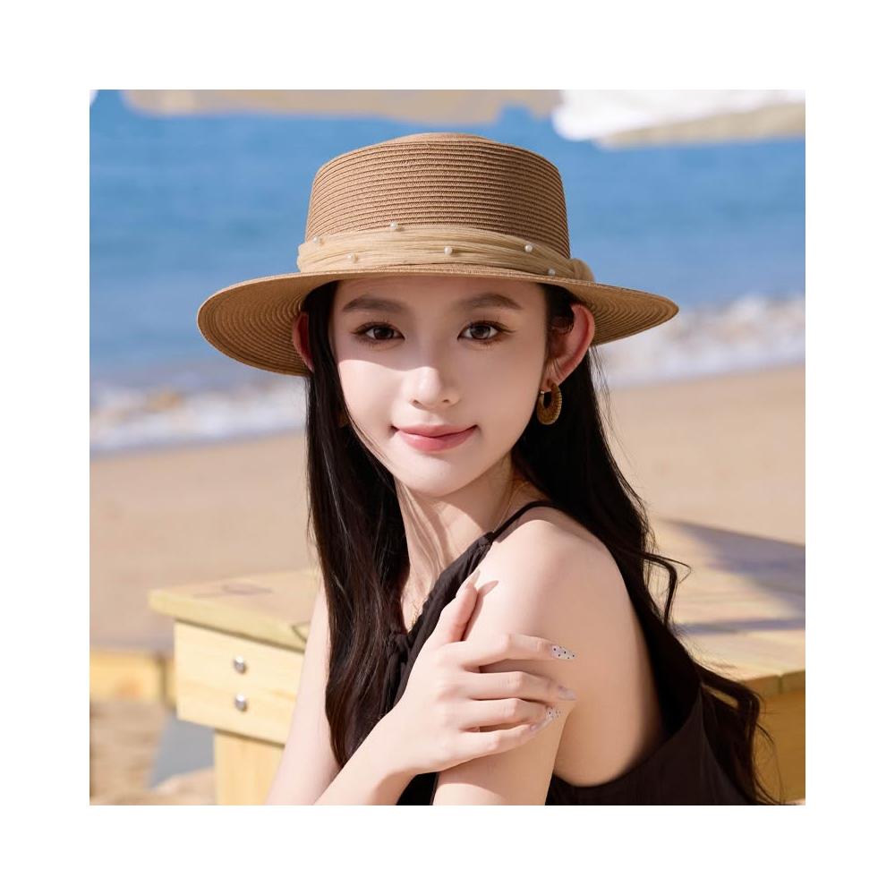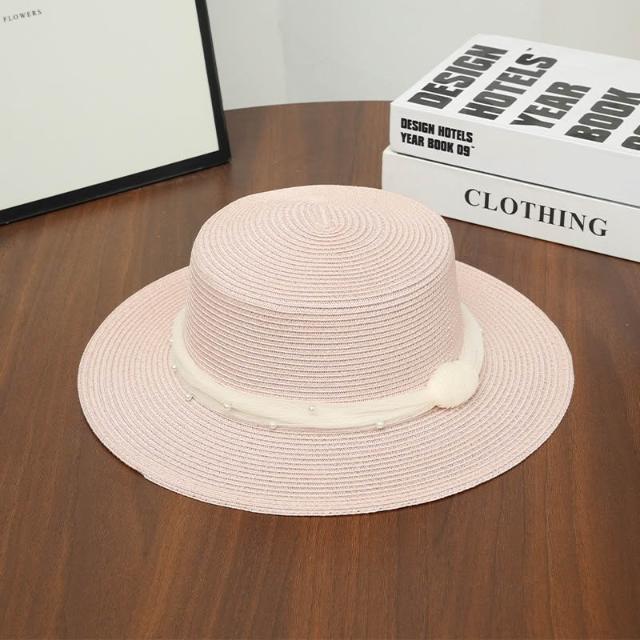 歐萊 韓版網紗珍珠平頂拉菲草帽海邊沙灘帽透氣平檐禮帽遮陽防曬帽子女