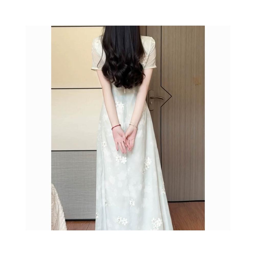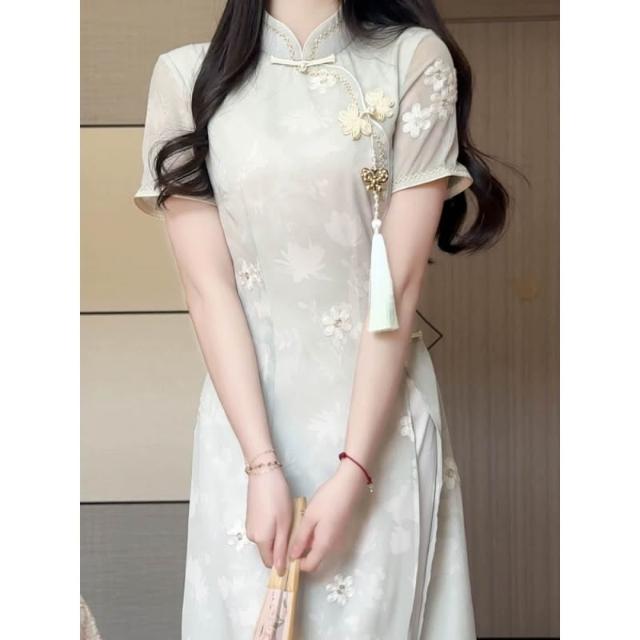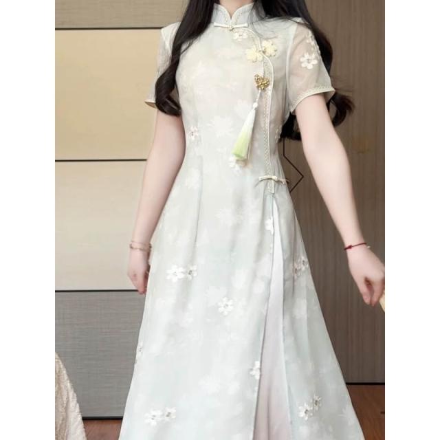 新款綠色中式奧黛旗袍年輕少女氣質連衣裙改良日常夏季