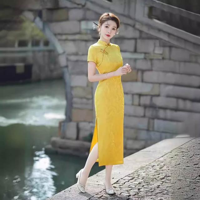 黃色旗袍夏季復古民國提花年輕款少女日常氣質改良連衣裙