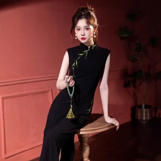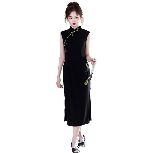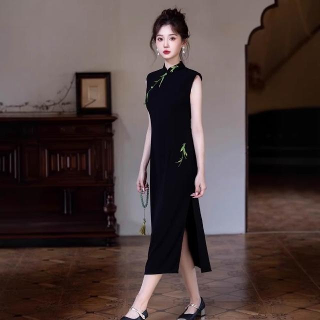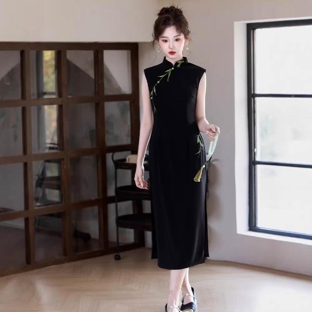新中式國風竹子改良旗袍年輕款少女氣質修身顯瘦無袖黑色連衣裙